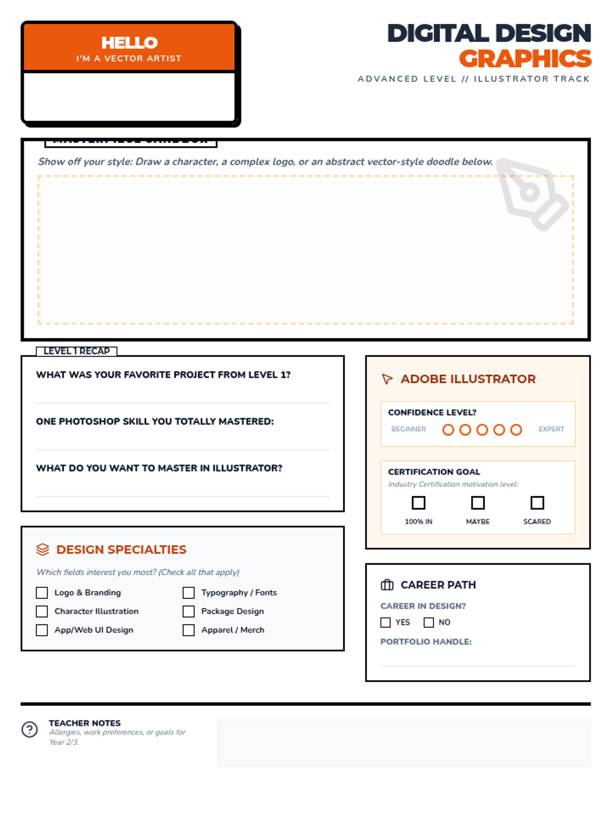 A specialized application worksheet for advanced Digital Design Graphics students focusing on Adobe Illustrator certification. Features vector-themed visuals, skill trackers, and career interest sections.