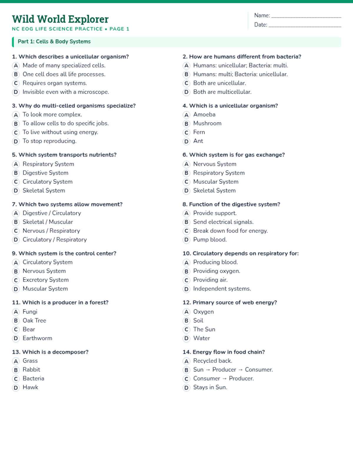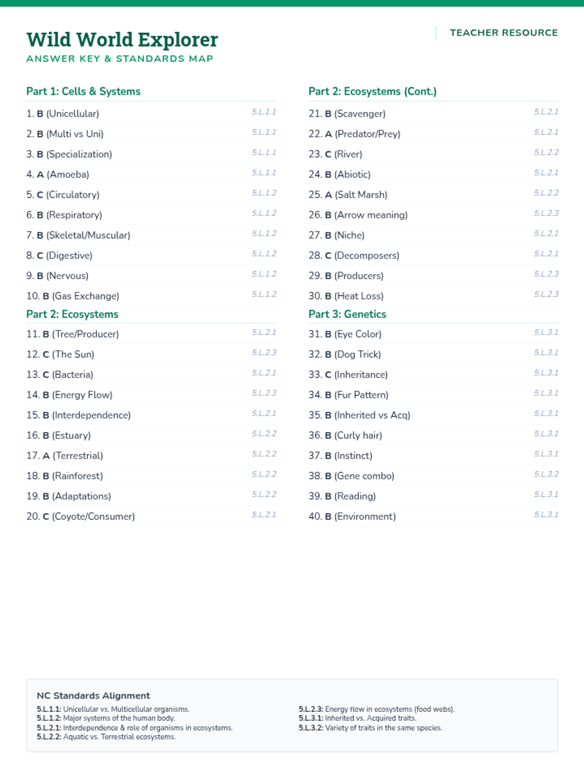 A 40-question multiple-choice worksheet covering the 5th Grade NC Life Science standards, including cells, body systems, ecosystems, and genetics. It is designed for EOG preparation with a clean, field-guide aesthetic. Now with corrected page headers and improved layout.