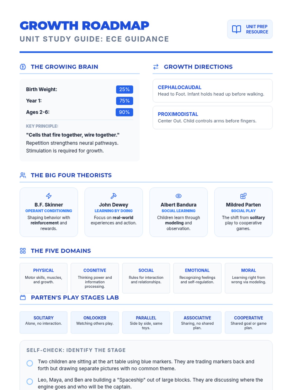 A comprehensive 2-page study guide for the Growth and Guidance Unit, covering brain development percentages, directional growth (Cephalocaudal/Proximodistal), the four major ECE theorists, the five developmental domains, Parten's play stages, and identity formation strategies. Now includes practice Parten vignettes for self-study.