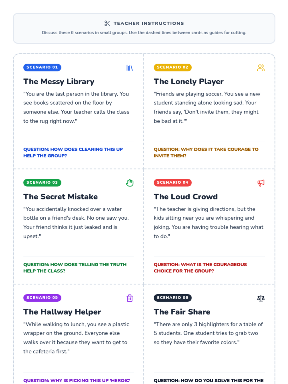 A set of 6 printable scenario cards designed for quick student discussion. Each card presents a relatable 3rd-grade dilemma where a student must choose between a selfish action and a courageous decision for the common good. Includes visual cut lines and improved readability.