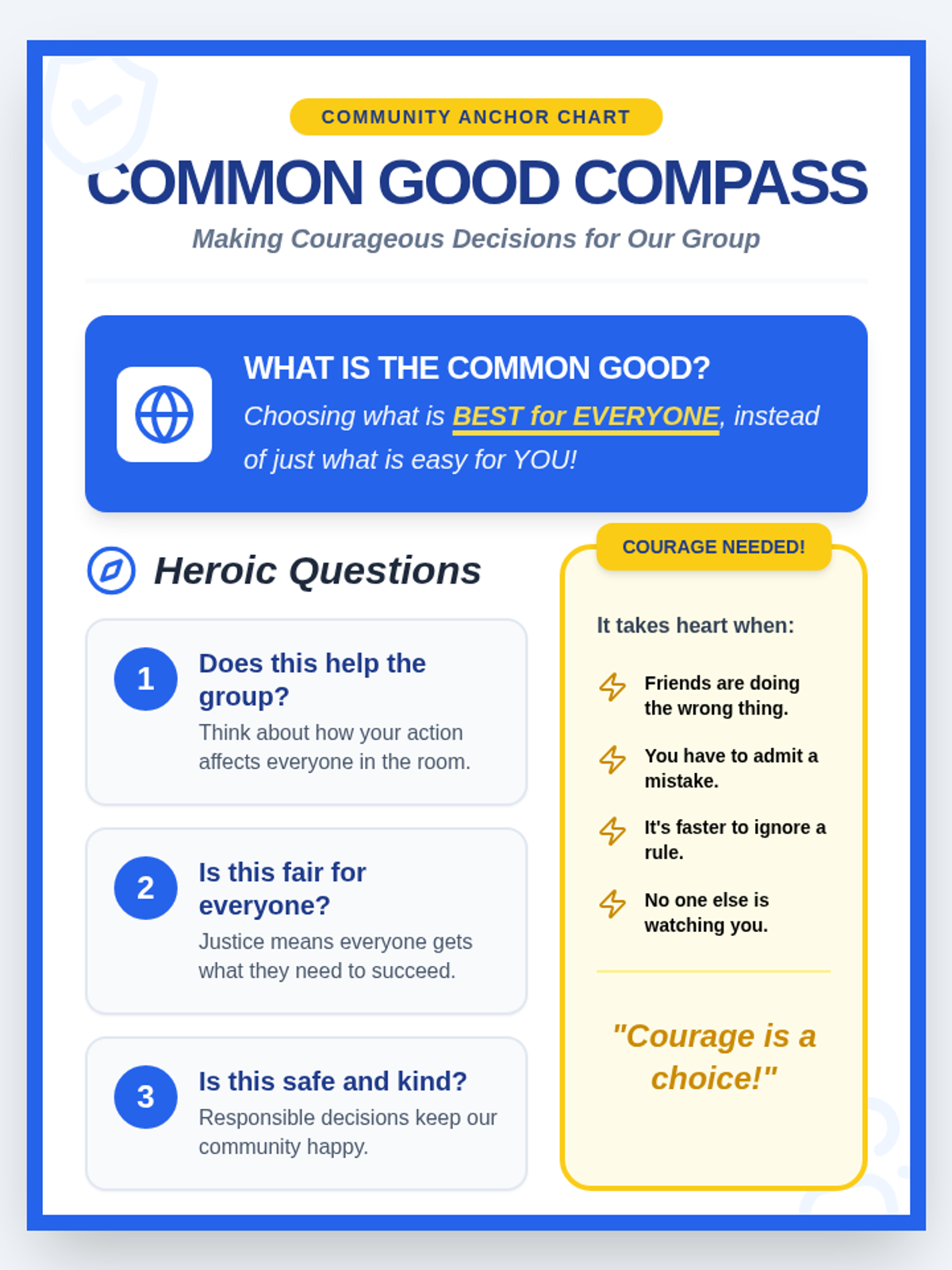 A bold, high-contrast anchor chart for classroom display. It features the 'Common Good Compass' with three guiding questions and a sidebar highlighting when courage is most needed, serving as a permanent visual reference for students.