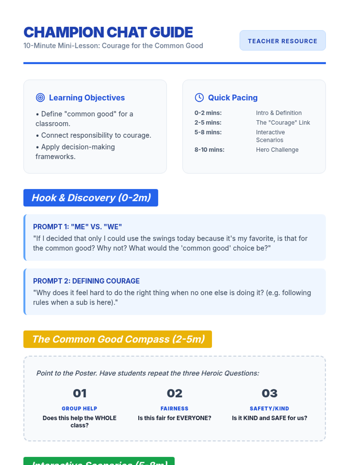 A comprehensive teacher's facilitator guide for the 10-minute Common Good lesson. Includes specific discussion prompts, time-stamped pacing, and deep-dive questions to link responsibility with courage.
