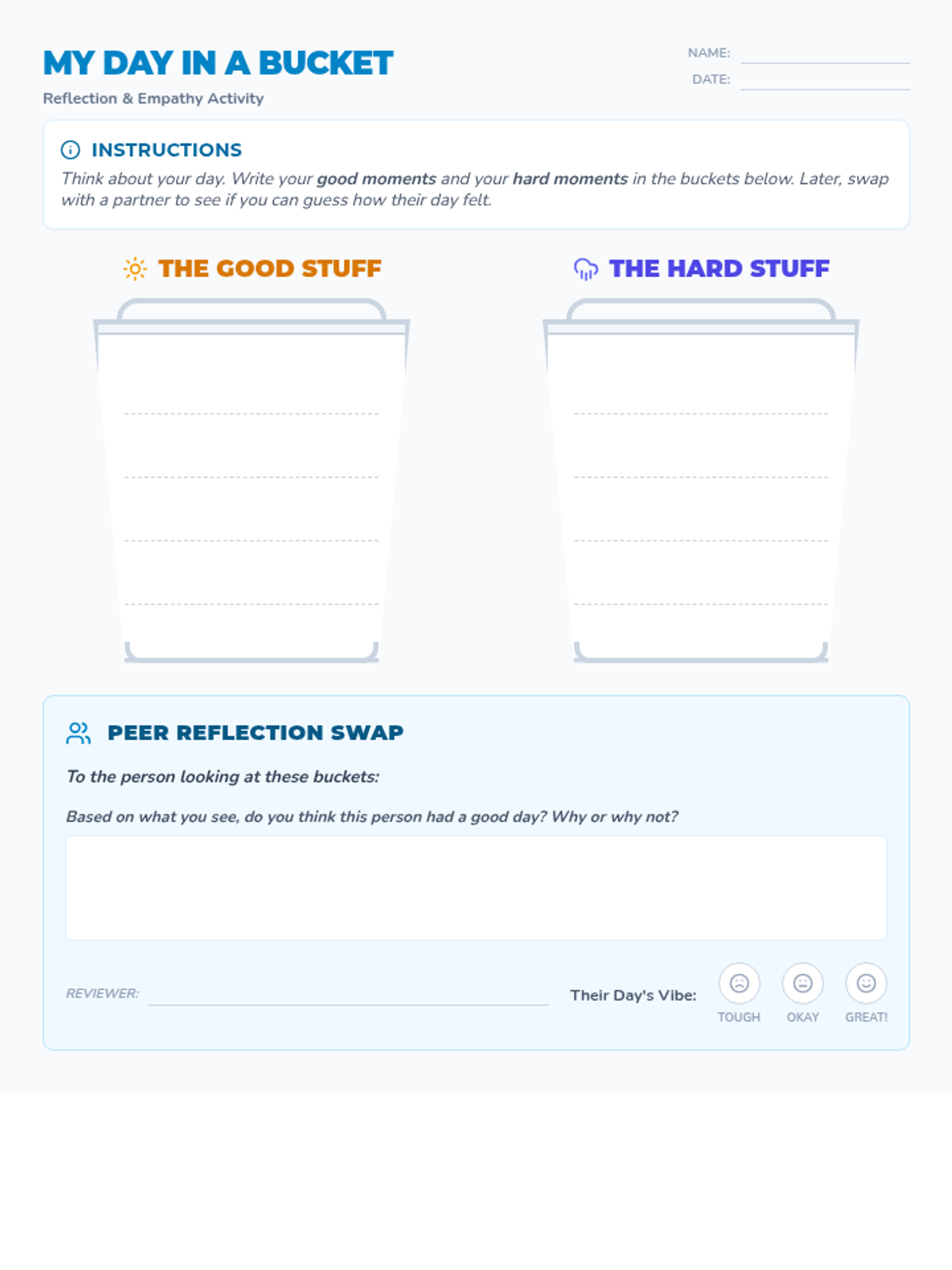 A refined student worksheet for reflecting on daily experiences using two distinct buckets for 'good' and 'hard' events, featuring a peer reflection section.