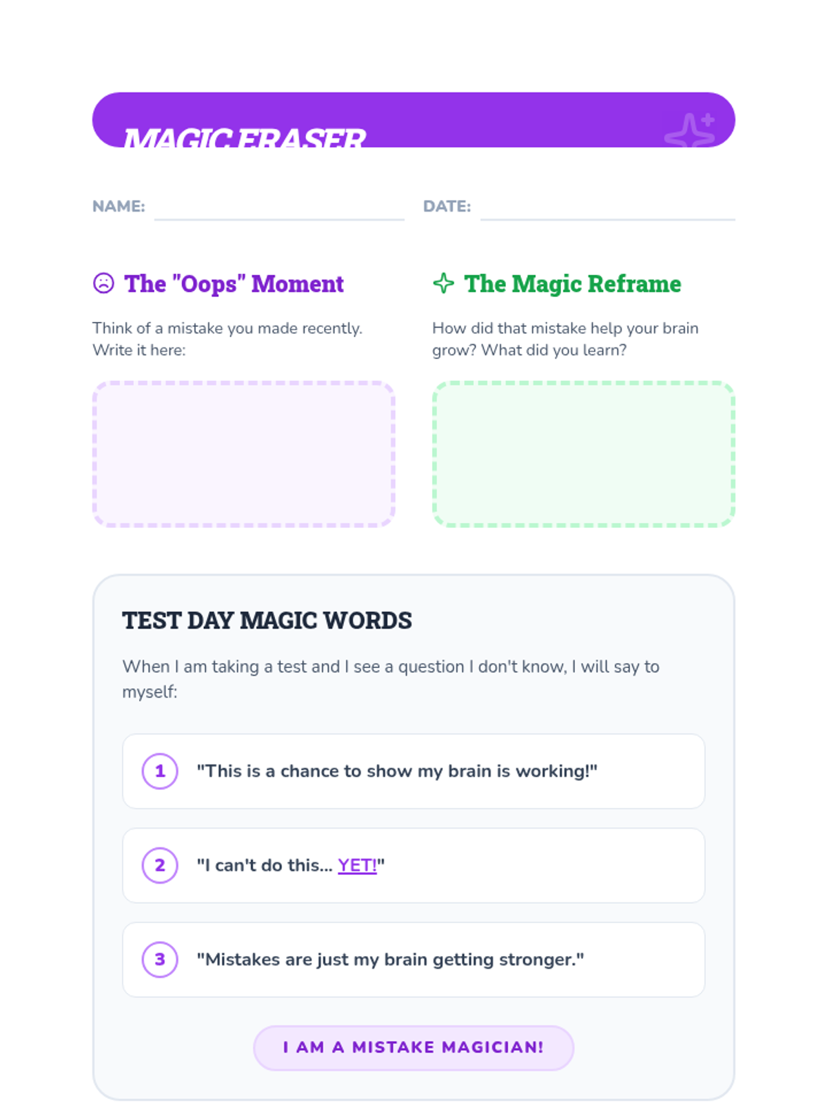 Student activity sheet for Session 3, focusing on reframing mistakes and learning "magic" self-talk phrases, optimized for 8.5x11 printing.