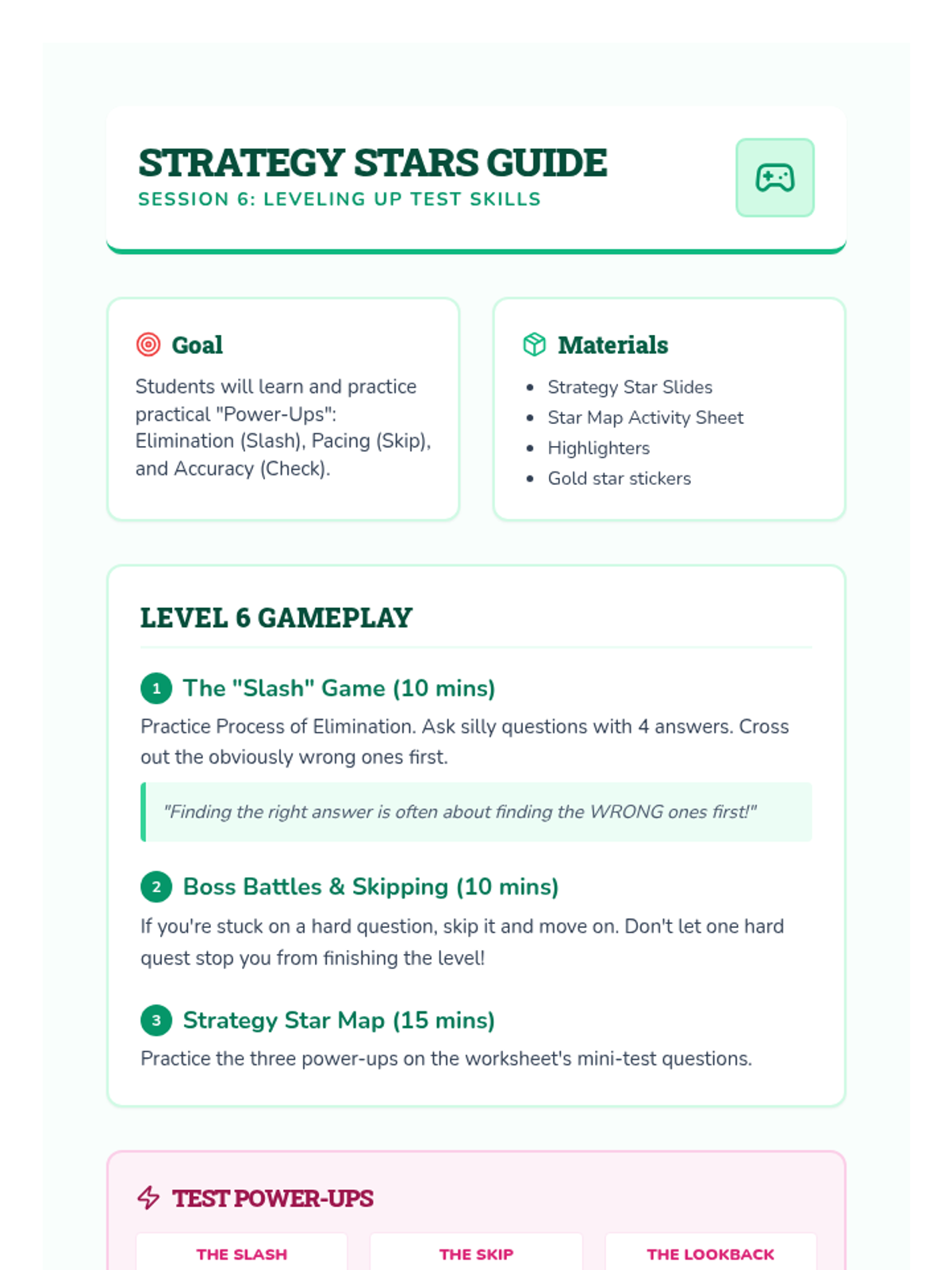 Slides for Session 6 teaching practical test-taking strategies through a video game theme.