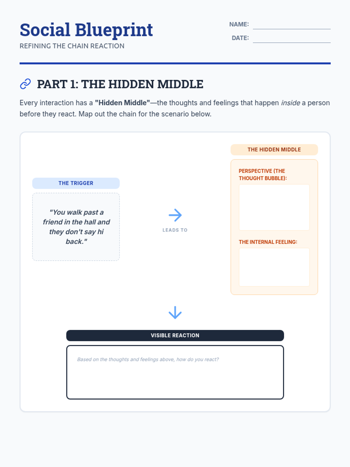 A student worksheet matching the 'Social Blueprint' slides, featuring two parts: 'The Hidden Middle' (mapping perspectives) and 'The Redraw' (conflict resolution practice).