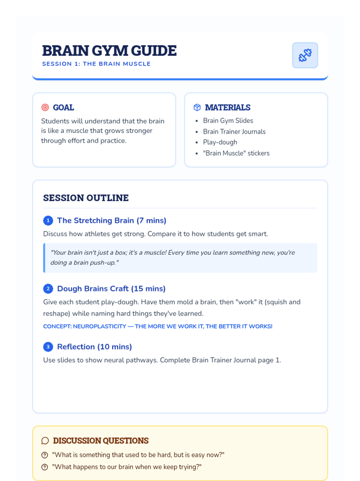 Teacher guide for Session 1, introducing the Brain Power Boosters program and the concept of neuroplasticity.