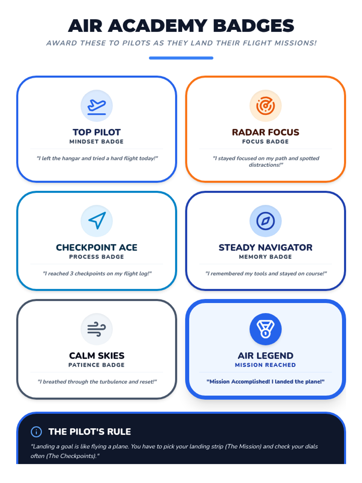 A set of six printable 'Achievement Badges' and a 'Pilot Rule' lesson tip for the Pilot theme. Thematic consistency and icon-alignment improved. Sized for single page.
