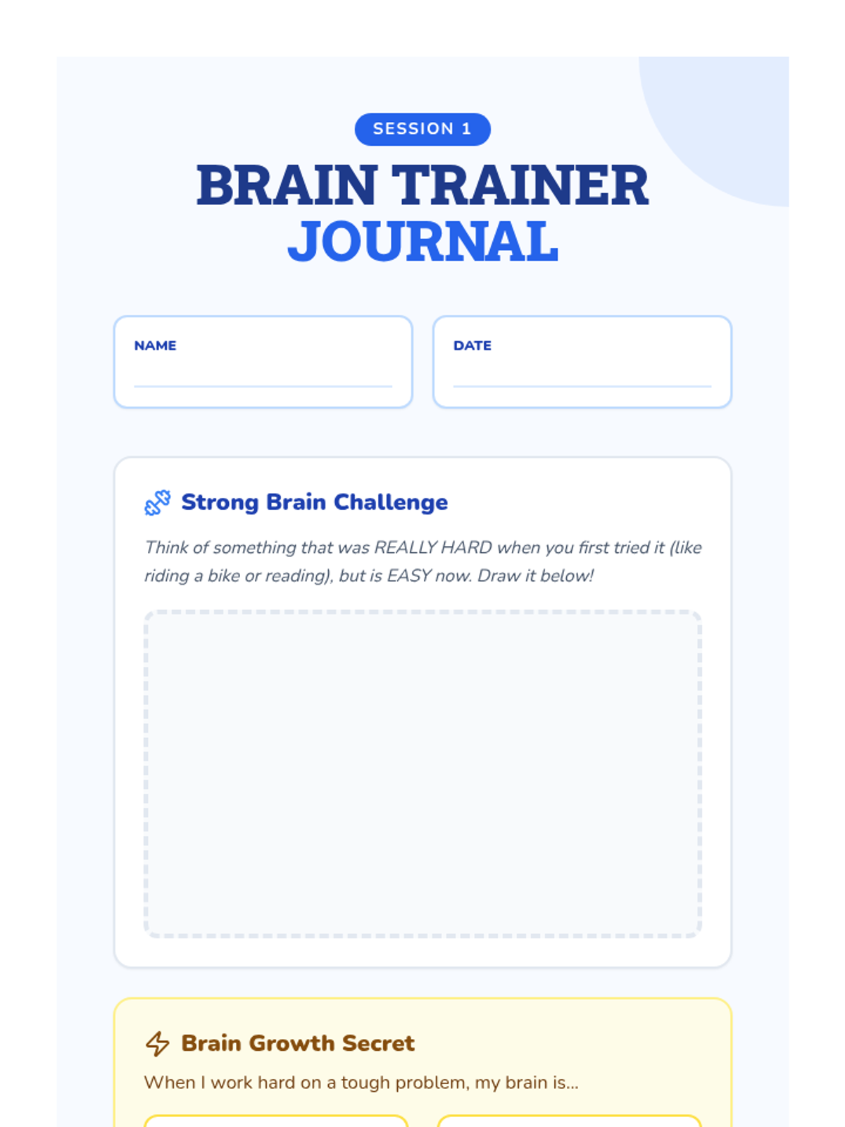 A 2-page student journal for Session 1, updated for 8.5x11 printing with clear work areas for drawing and reflection.