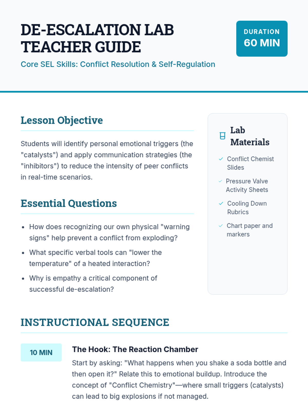 A comprehensive facilitation guide for teachers to lead the De-escalation Lab session, including lesson objectives, timing, step-by-step instructions, and differentiation strategies.