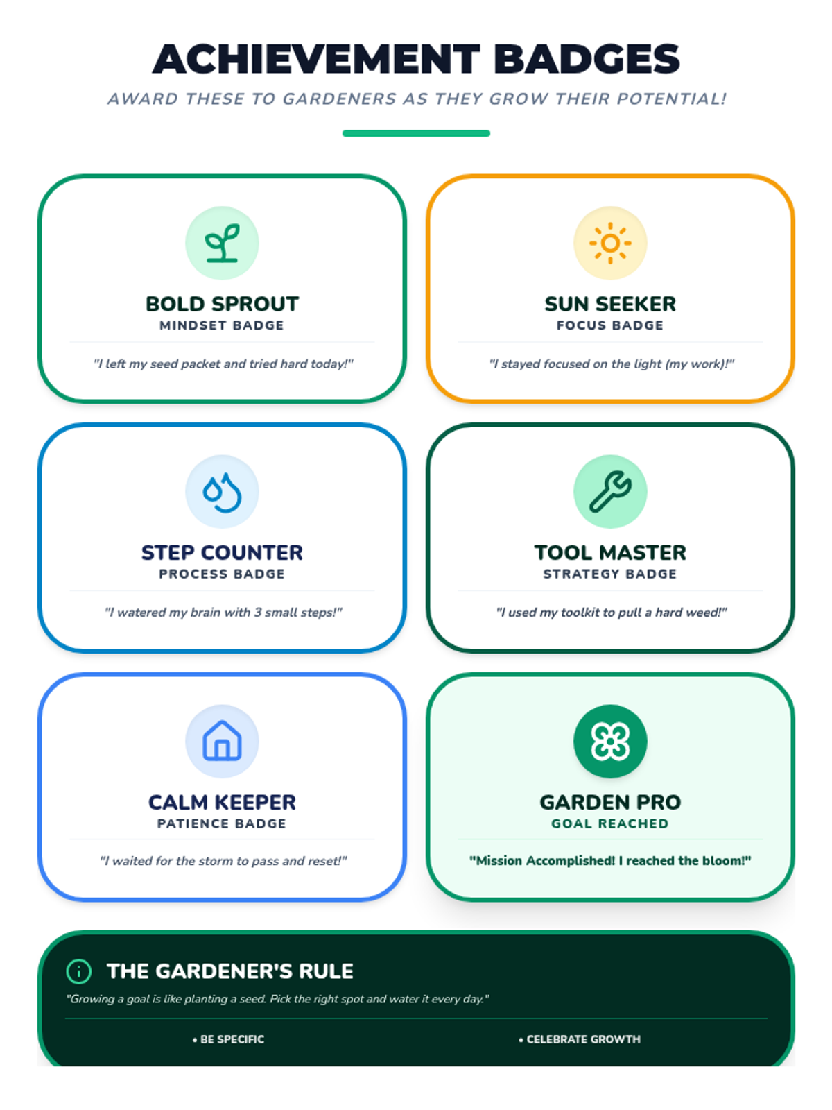 A set of six printable 'Achievement Badges' and a 'Gardener Rule' lesson tip for the Garden theme. Thematic consistency and icon-alignment improved. Sized for single page. Layout fixed for fit. Header layout fixed for fit. Spacing refined. Standardized category labels and rounding.
