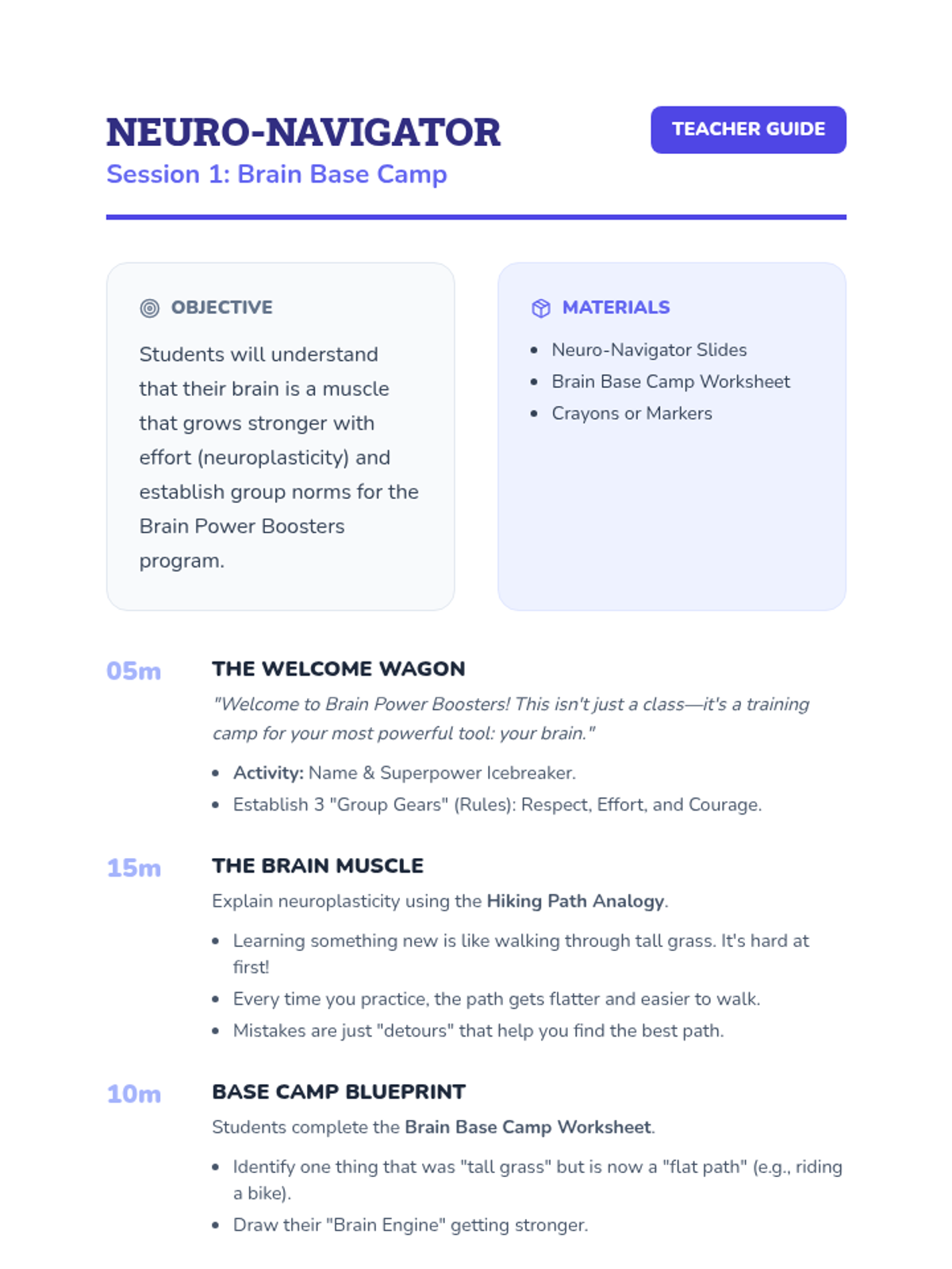 Teacher guide for Session 1, optimized for 8.5x11 printing with a clean layout and focused instructional points.