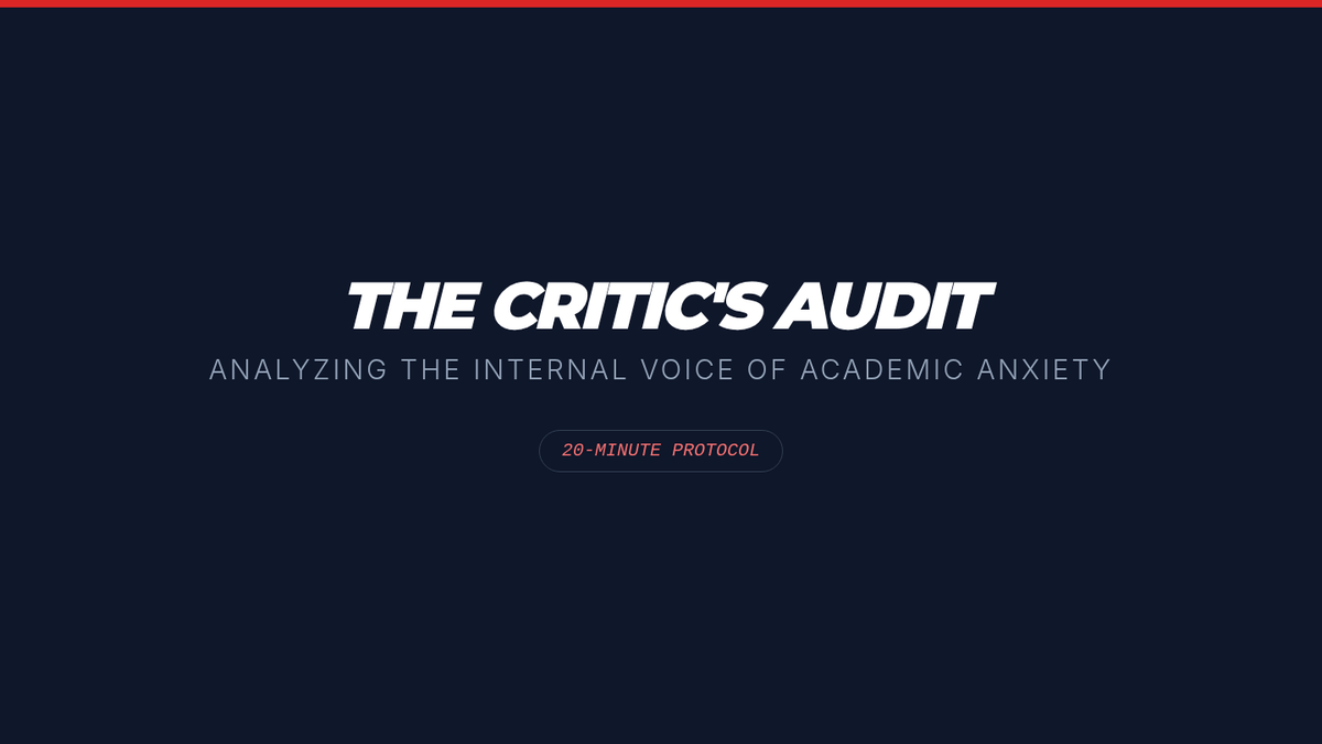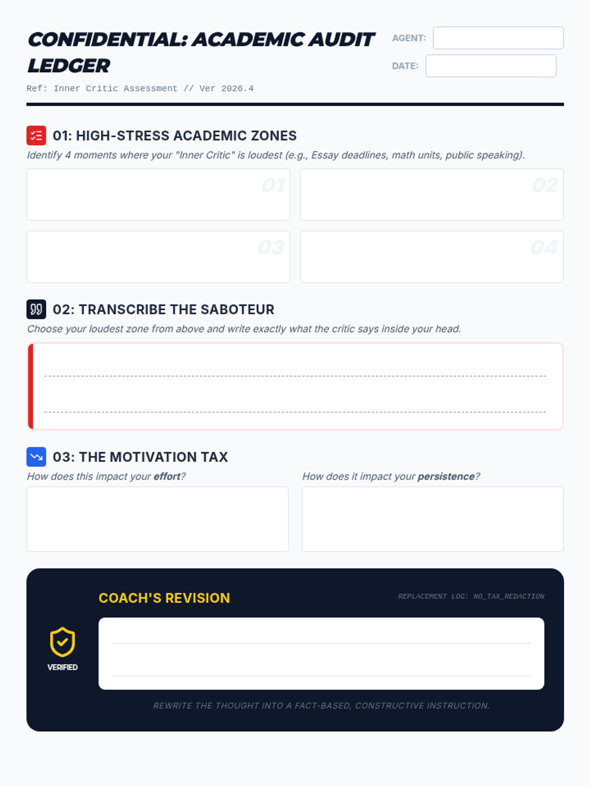 A structured 'Academic Audit Ledger' handout where students list their academic anxiety triggers, transcribe their inner critic's specific messaging, and map out the negative impact on their motivational effort and persistence.
