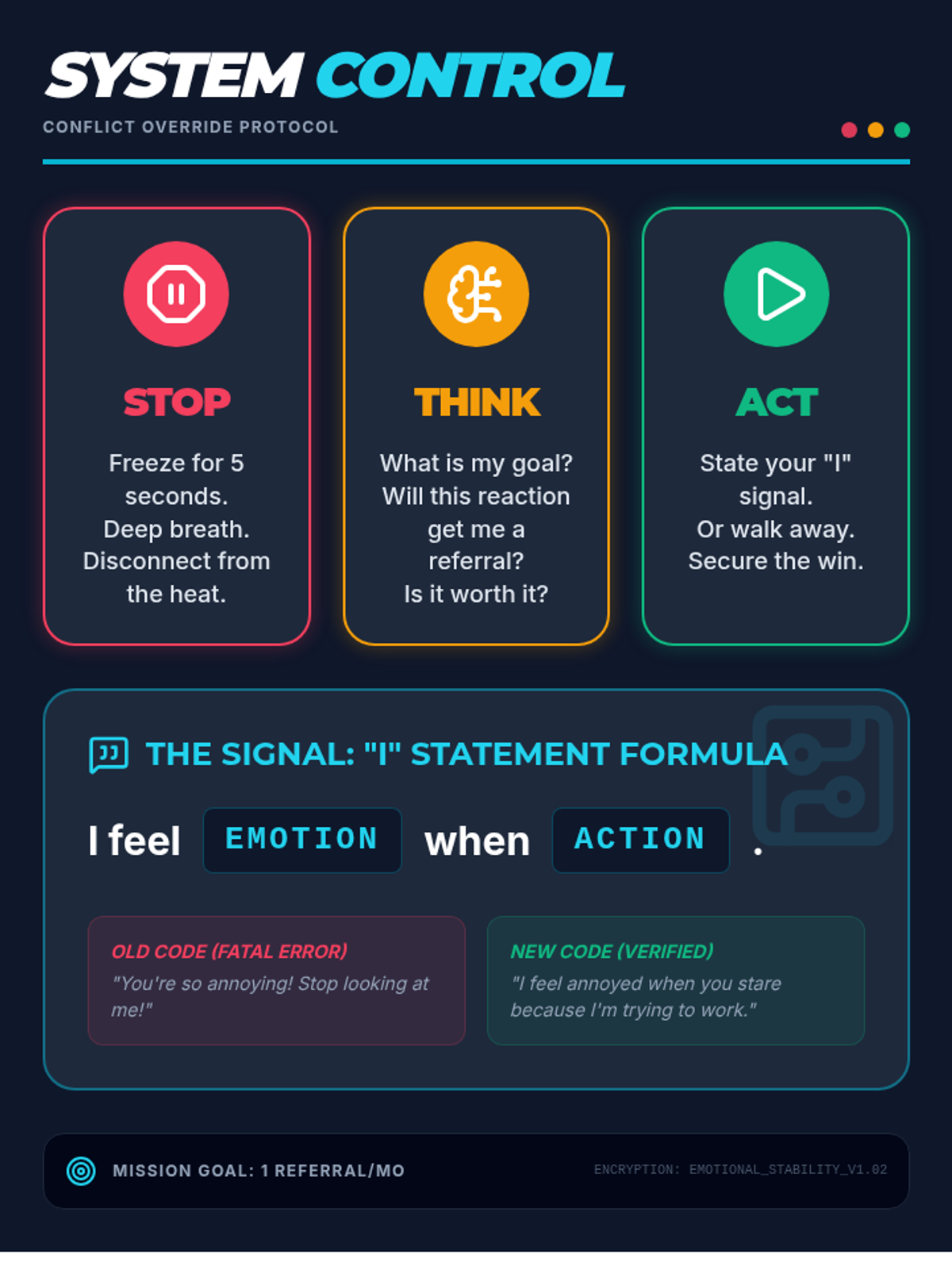 A high-impact visual anchor chart for a student's desk, featuring the Stop-Think-Act circuit breaker and the "I" statement formula in a modern, tech-themed design.