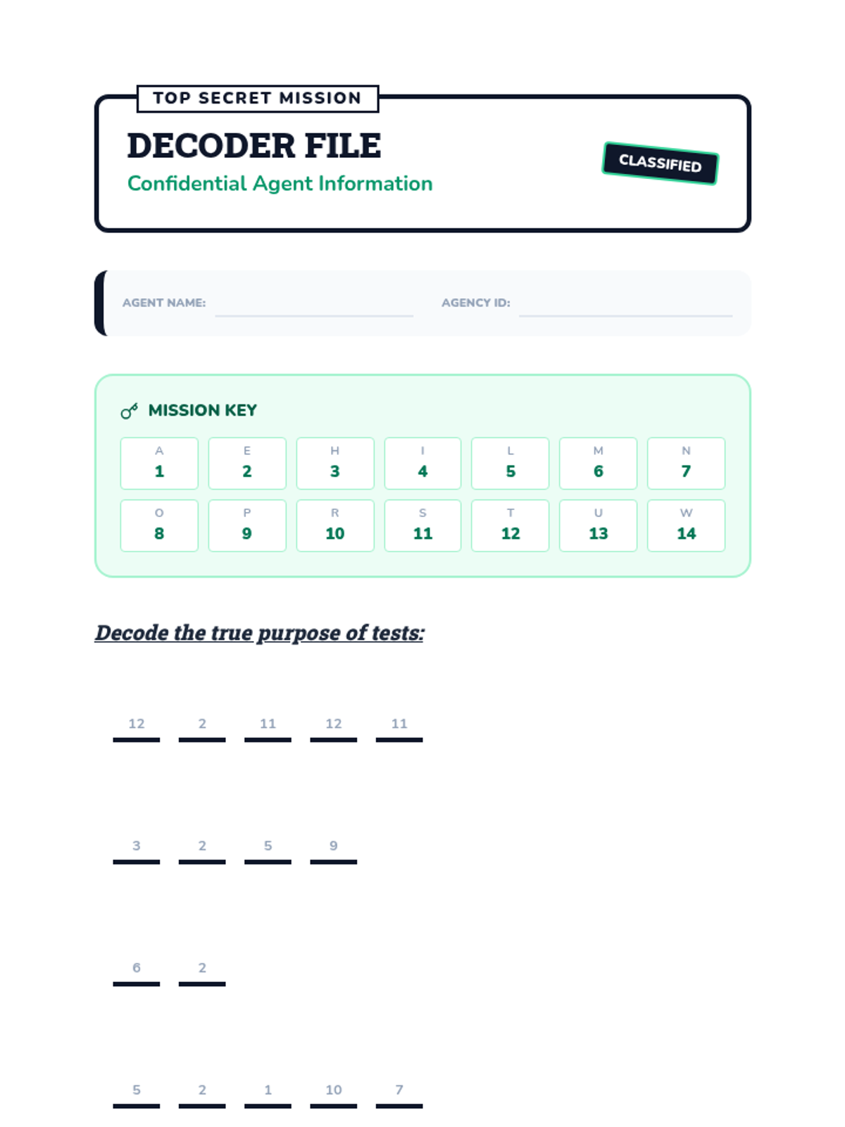 Student activity sheet for Session 4, where they use a code to discover the purpose of testing, optimized for 8.5x11 printing.