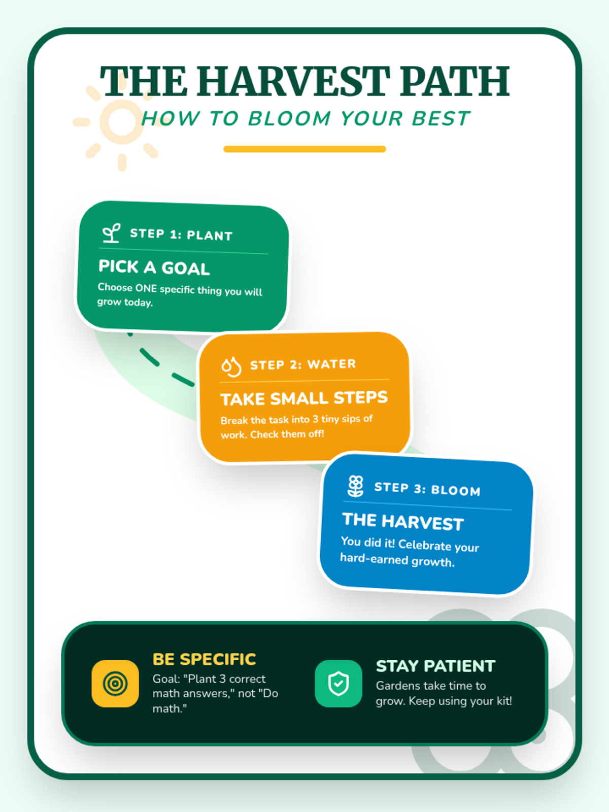 A visual anchor chart for the Garden theme illustrating the three-step goal-setting process: Plant (Goal), Water (Steps), and Bloom (Celebration). Sized for single page.