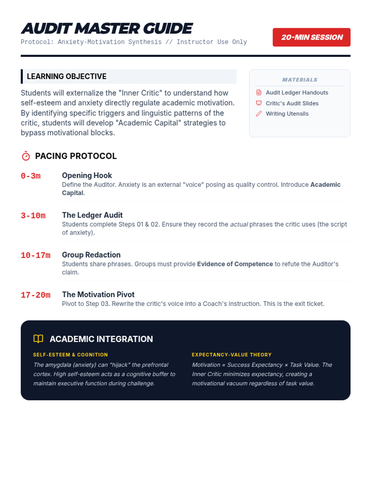 A teacher-facing facilitation guide for the 'Critics Audit' session. Includes a tight 20-minute pacing protocol, discussion prompts for groups, and deep academic background connecting self-esteem to cognitive function and motivation theory.