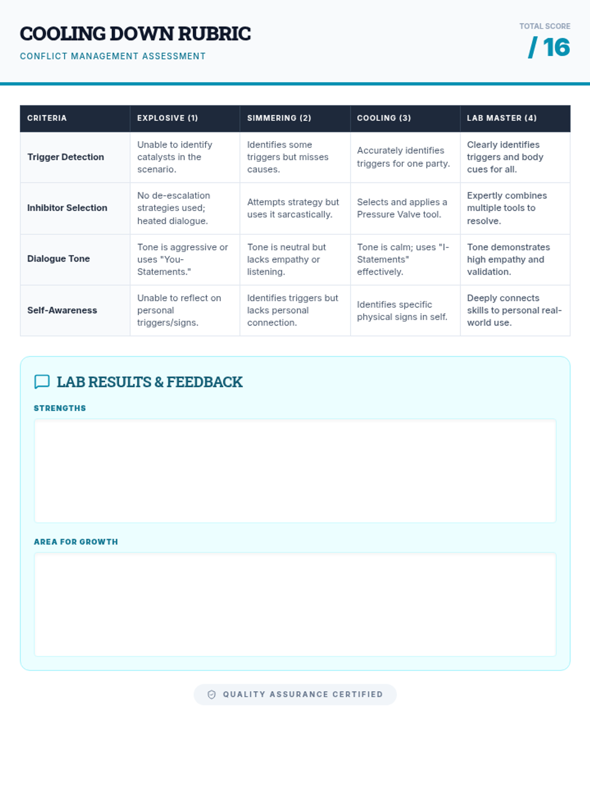 A detailed grading rubric for teachers to assess student work on de-escalation skills, ranging from 'Explosive' to 'Lab Master' levels of proficiency.