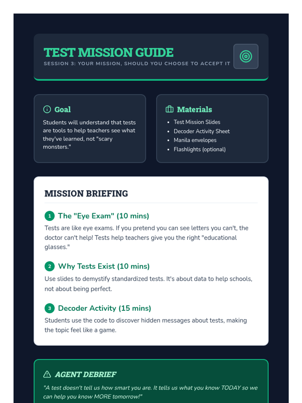 Teacher guide for Session 3, focusing on the purpose of standardized tests as a diagnostic tool.