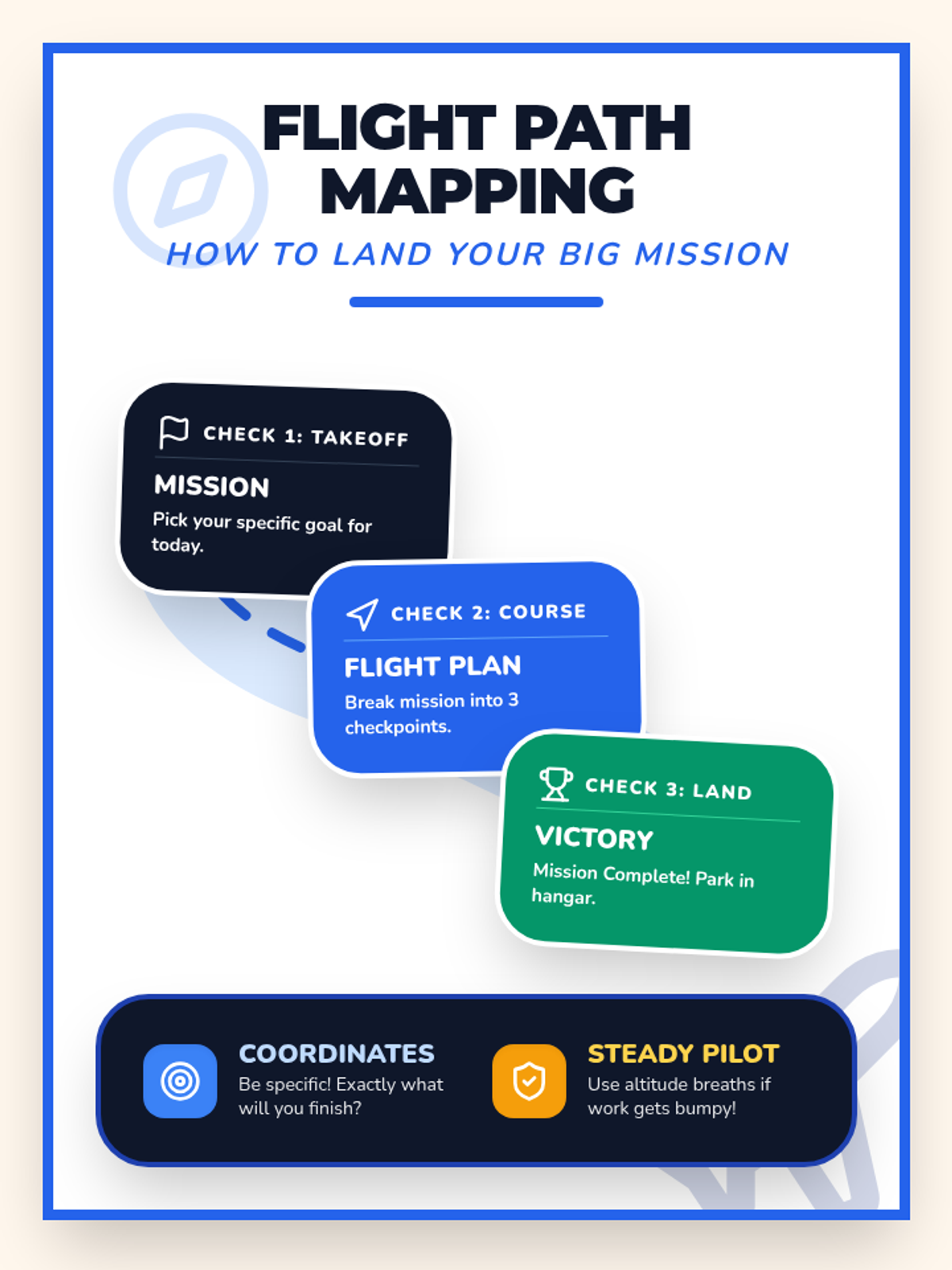 A visual anchor chart for the Pilot theme illustrating the three-step goal-setting process: Takeoff (Goal), Flight Plan (Steps), and Landing (Celebration). Sized for single page. Path fixed. Flow adjusted for standard reading.