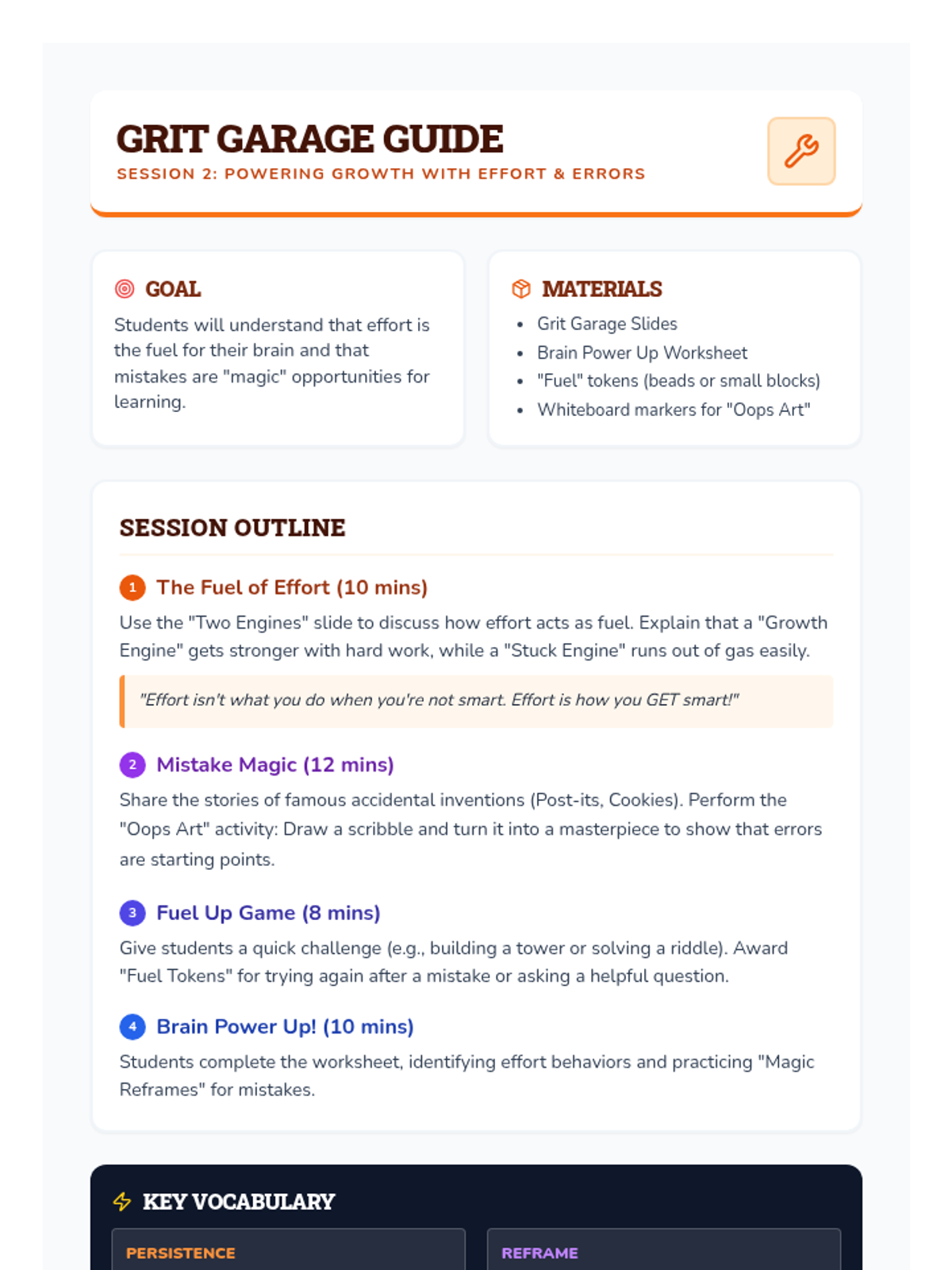 Teacher guide for the combined Session 2, focusing on effort as fuel and learning from mistakes.