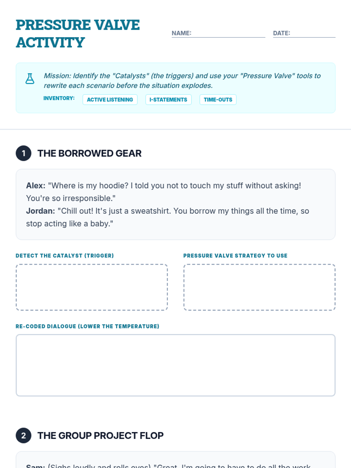 A student worksheet featuring conflict scenarios ('The Borrowed Gear' and 'The Group Project Flop') where students identify triggers and rewrite dialogue using de-escalation techniques.