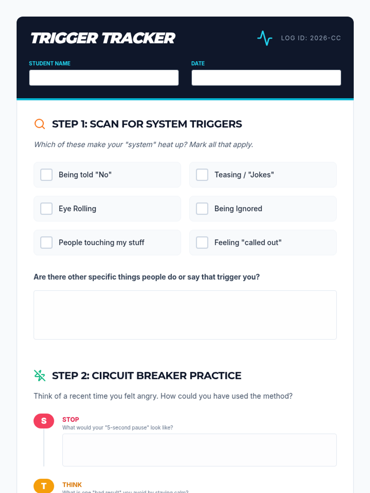 A guided self-reflection worksheet for the student to identify their personal triggers and practice the Stop-Think-Act method and "I" statements in a technical, log-style format.