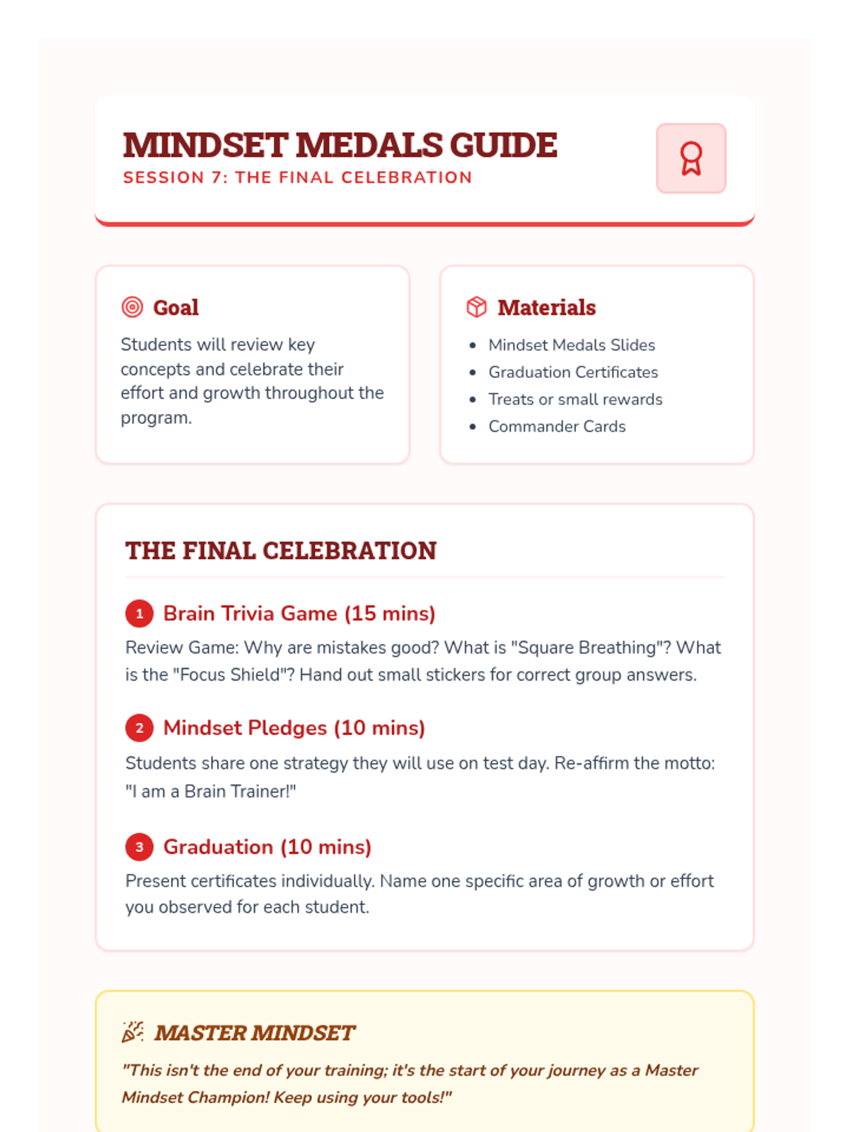 Teacher guide for Session 7, the final celebration of the Brain Power Boosters group, including a review game and graduation ceremony.