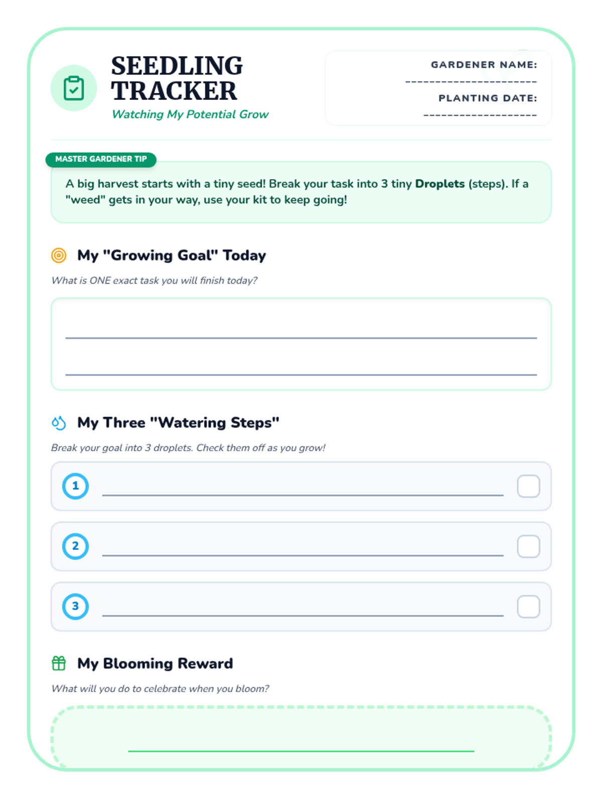 A student goal-setting worksheet for the Garden theme. Helps students break a task into 3 steps and identify a reward. Spacing adjusted for 1-page fit. Meta-theme consistent. Header layout fixed for readability. Line contrast improved. Metaphor placeholder removed.