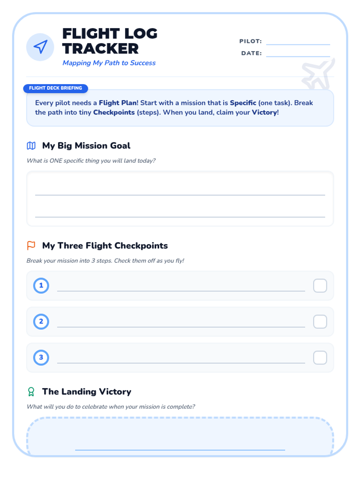 A student goal-setting worksheet for the Pilot theme. Helps students break a task into 3 checkpoints and identify a reward. Sized for 1-page fit. Meta-theme consistent. Header layout fixed for readability. Line contrast improved.
