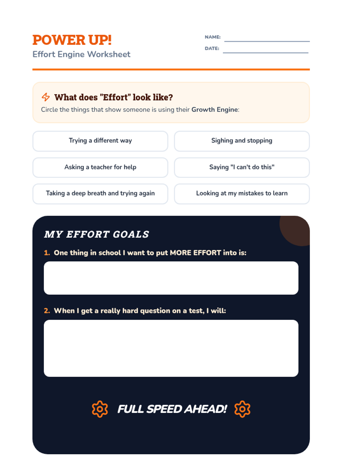 Student worksheet for Session 2 where they identify growth mindset behaviors and set personal effort goals, optimized for 8.5x11 printing.