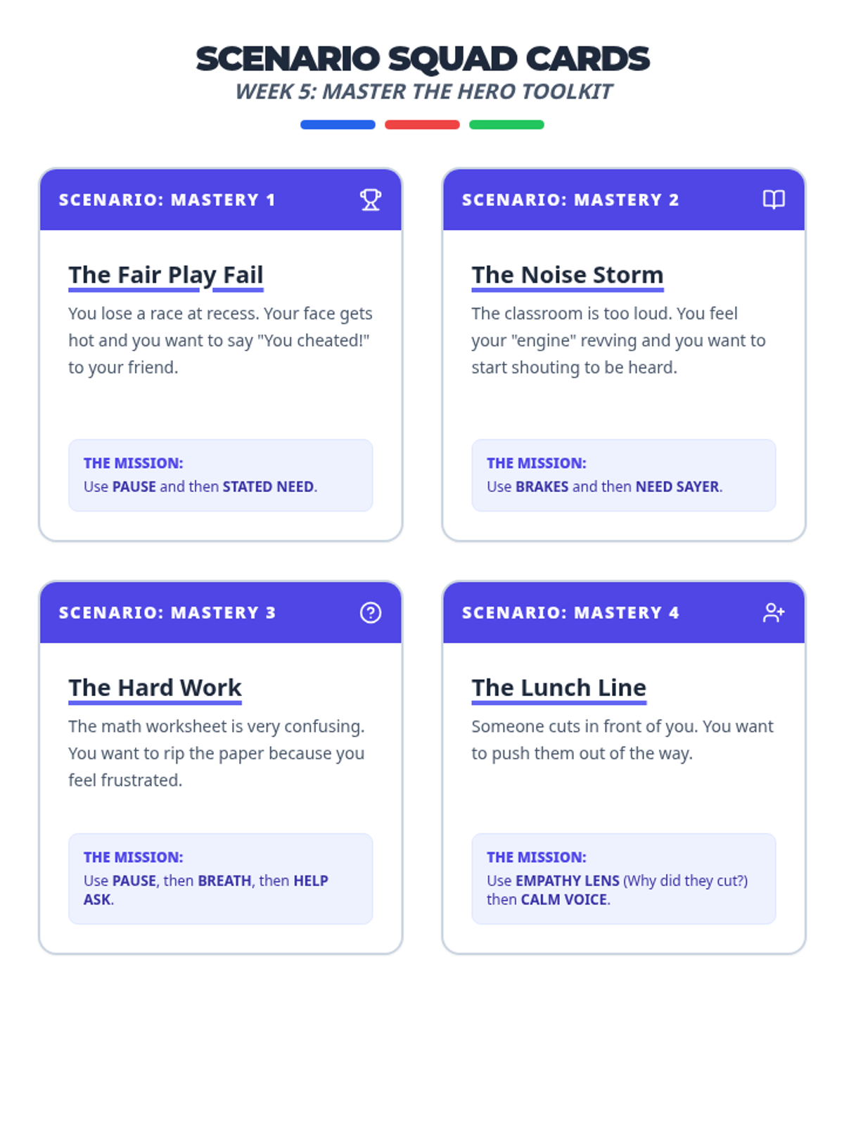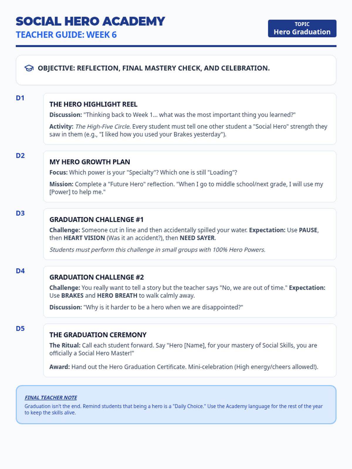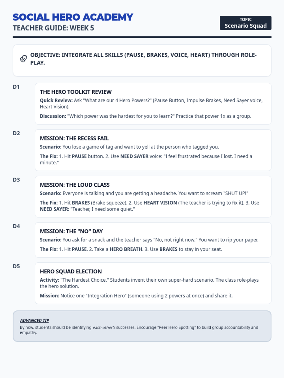 Updated Facilitator Guide for Week 7: Practice Pals. Aligned with the new 'Superpower Roll Call' check-in and the 'Match-Up Quest' worksheet. Includes specific scripts for the hero poses and guidance for the matching activity. Optimized for single-page printing.