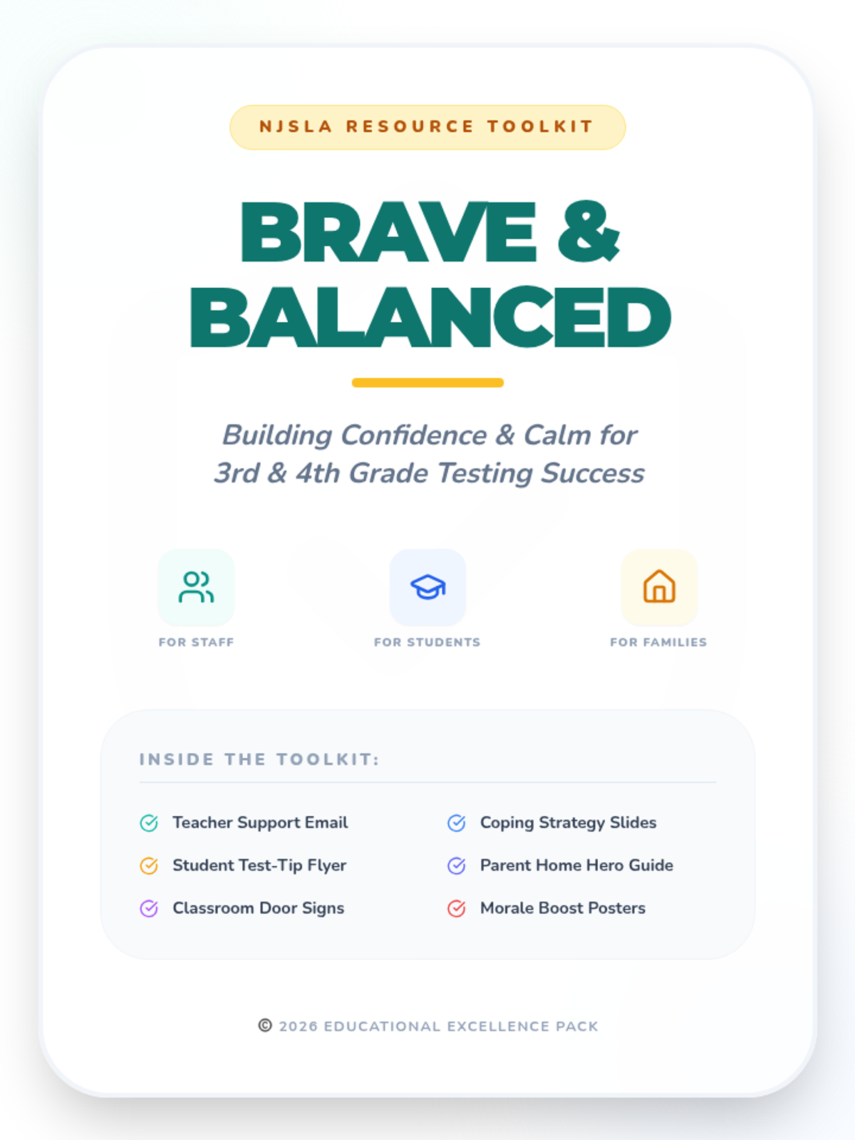 A professional and high-impact cover page for the Brave and Balanced NJSLA toolkit, featuring a clear overview of contents and instructional goals.