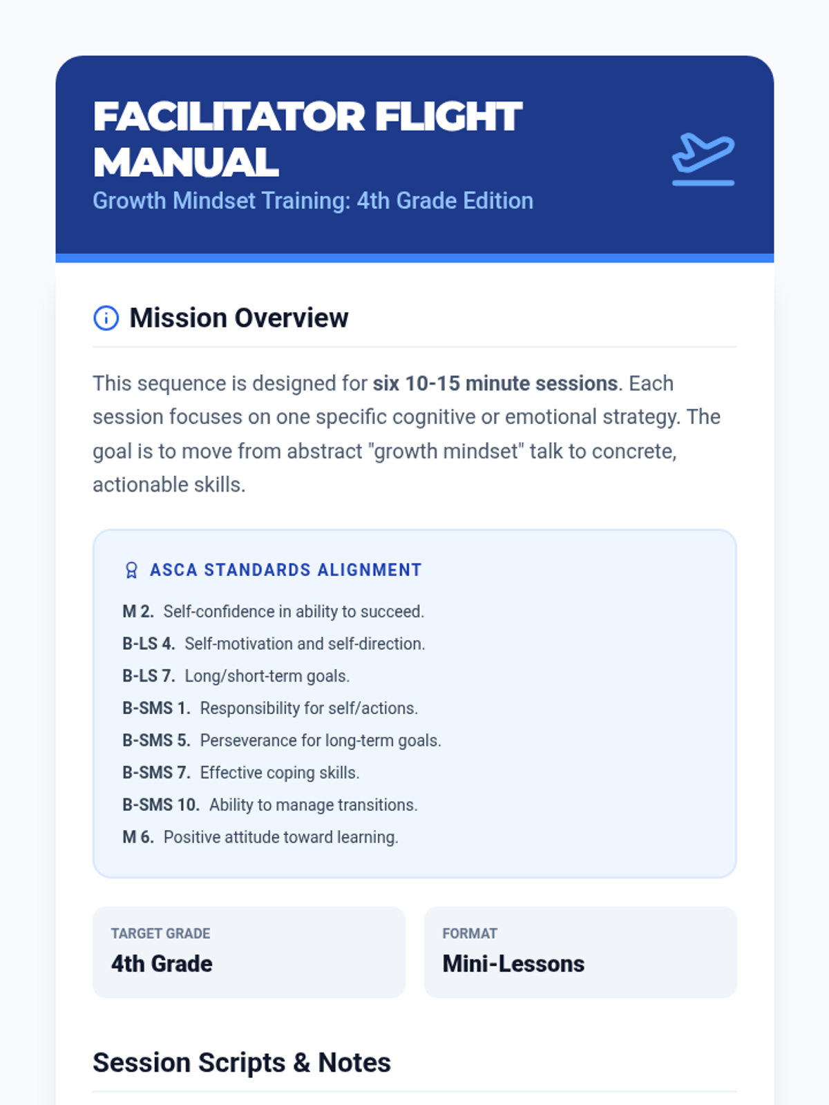 A granular, 6-session roadmap for the 'Neural Pioneers' growth mindset sequence. Includes minute-by-minute breakdowns (Launch, Explore, Mission) and material alignment for 4th-grade sessions. Spacing and content optimized for clarity.