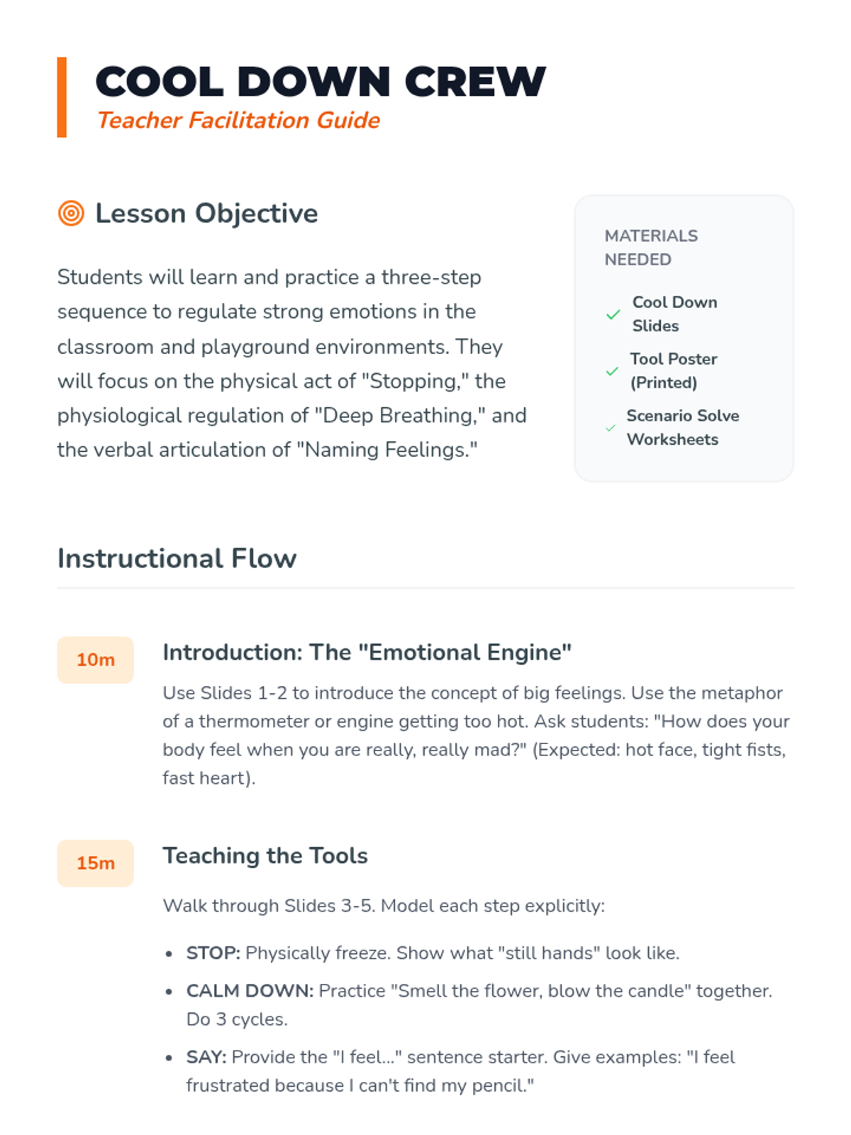 A comprehensive teacher guide for facilitating the Cool Down Crew lesson, including lesson objectives, timing, instructional flow, and tips for classroom implementation.