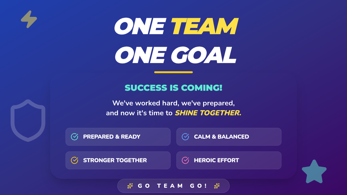 A high-energy, animated digital "unified success" slide designed to boost school morale without audience categorization, specifically for teachers to share with their classes.