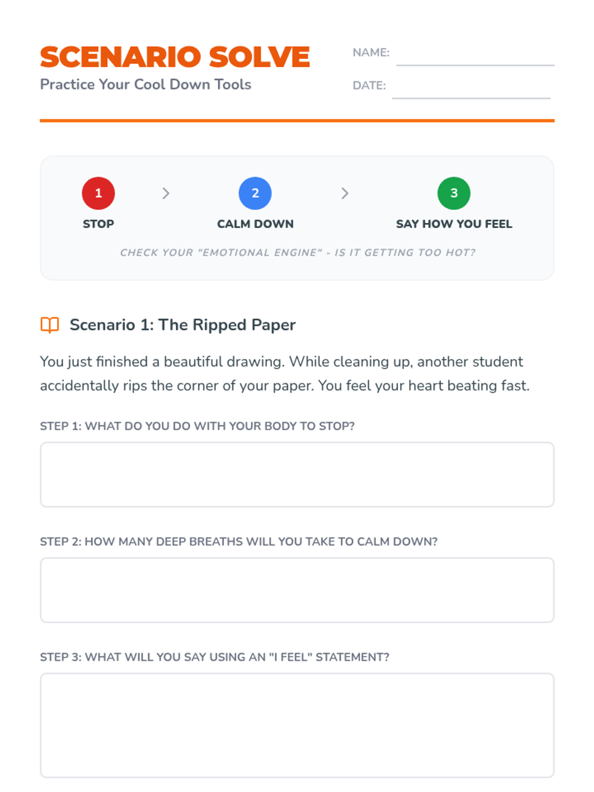 A practice worksheet where students apply the 3-step calming strategy to realistic social scenarios, with space for writing and drawing responses.