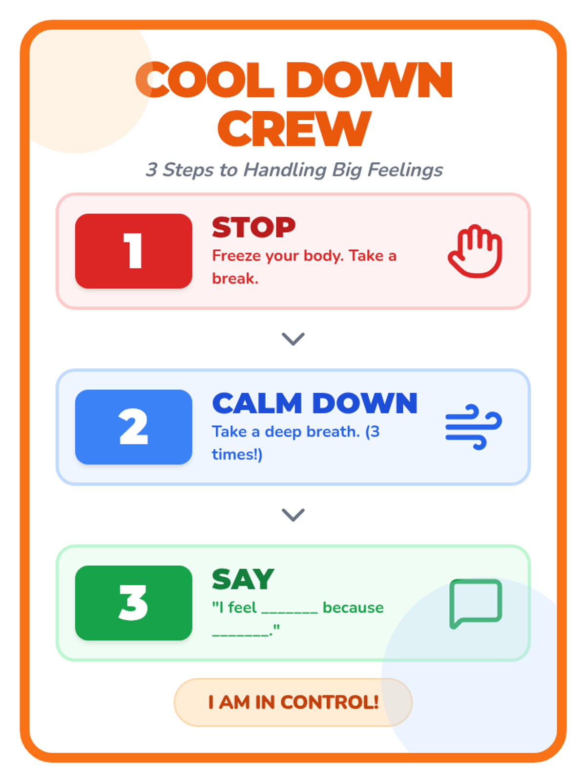 A printable classroom anchor chart/poster clearly outlining the 3-step calming strategy with large text and bold icons for student reference.