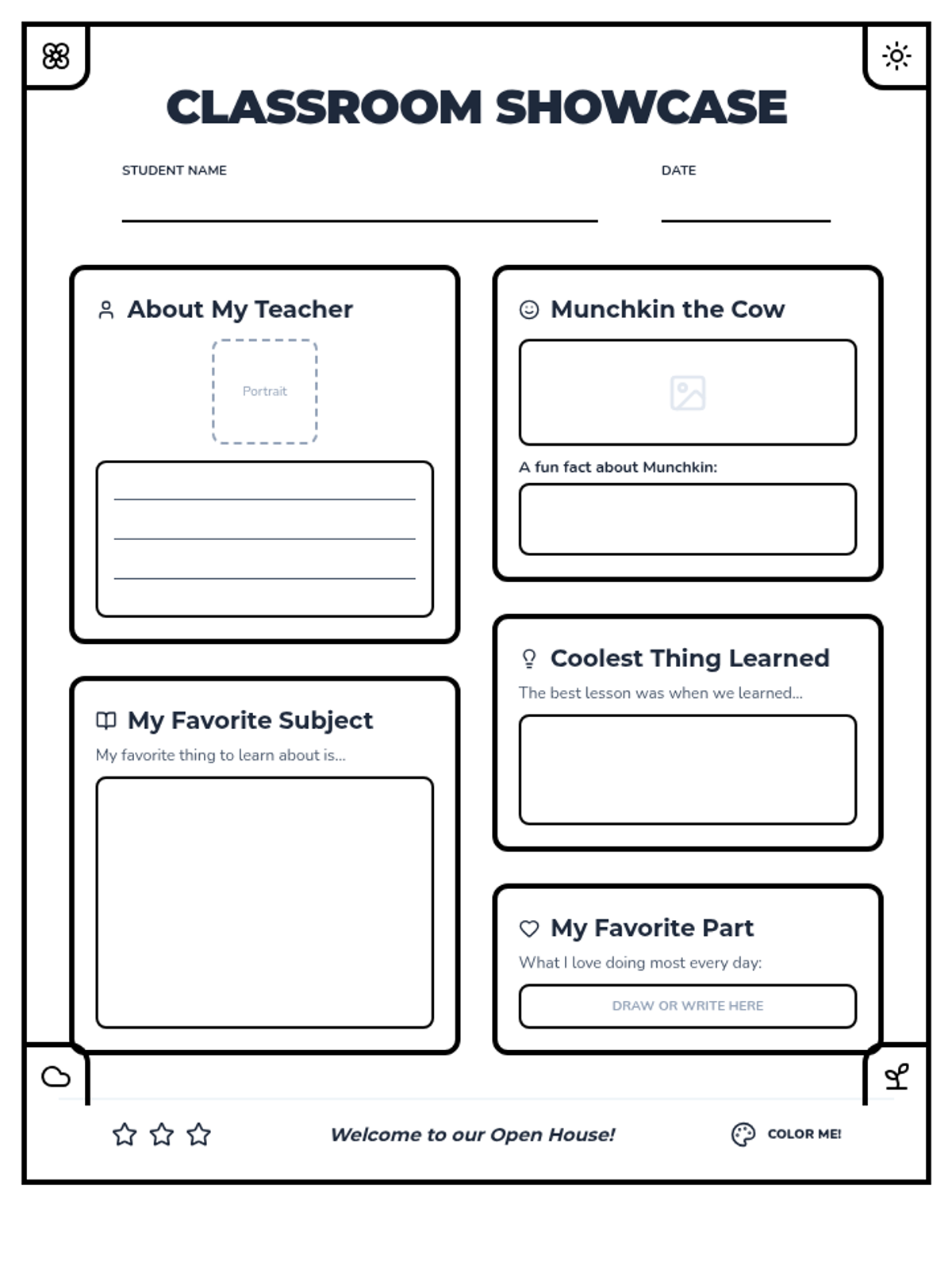 A revised one-page interactive poster for students to complete for a Spring Open House. It features dedicated sections for classroom memories and teacher appreciation, optimized for a single-page printable layout with coloring-book style borders.