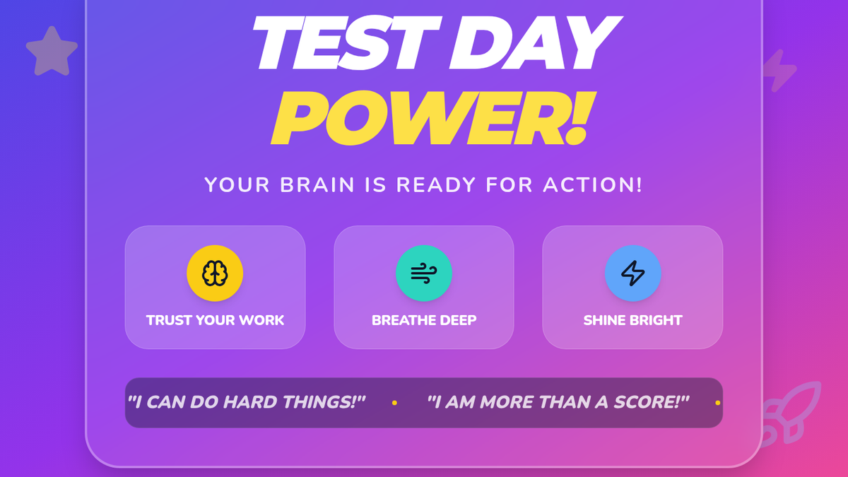 A high-energy, animated digital "hype poster" slide designed to be projected in the classroom on testing mornings to boost student morale and provide a positive environment.
