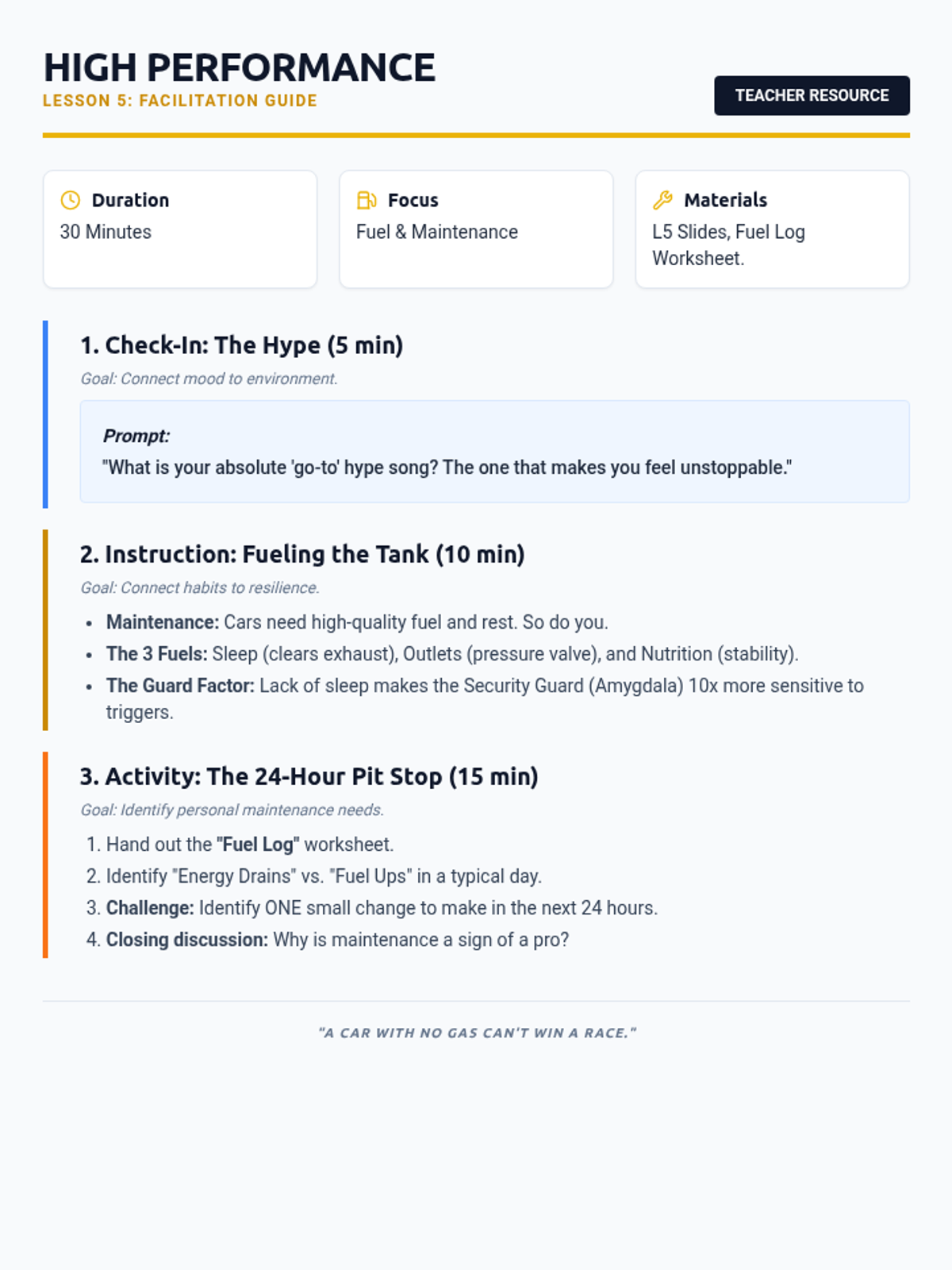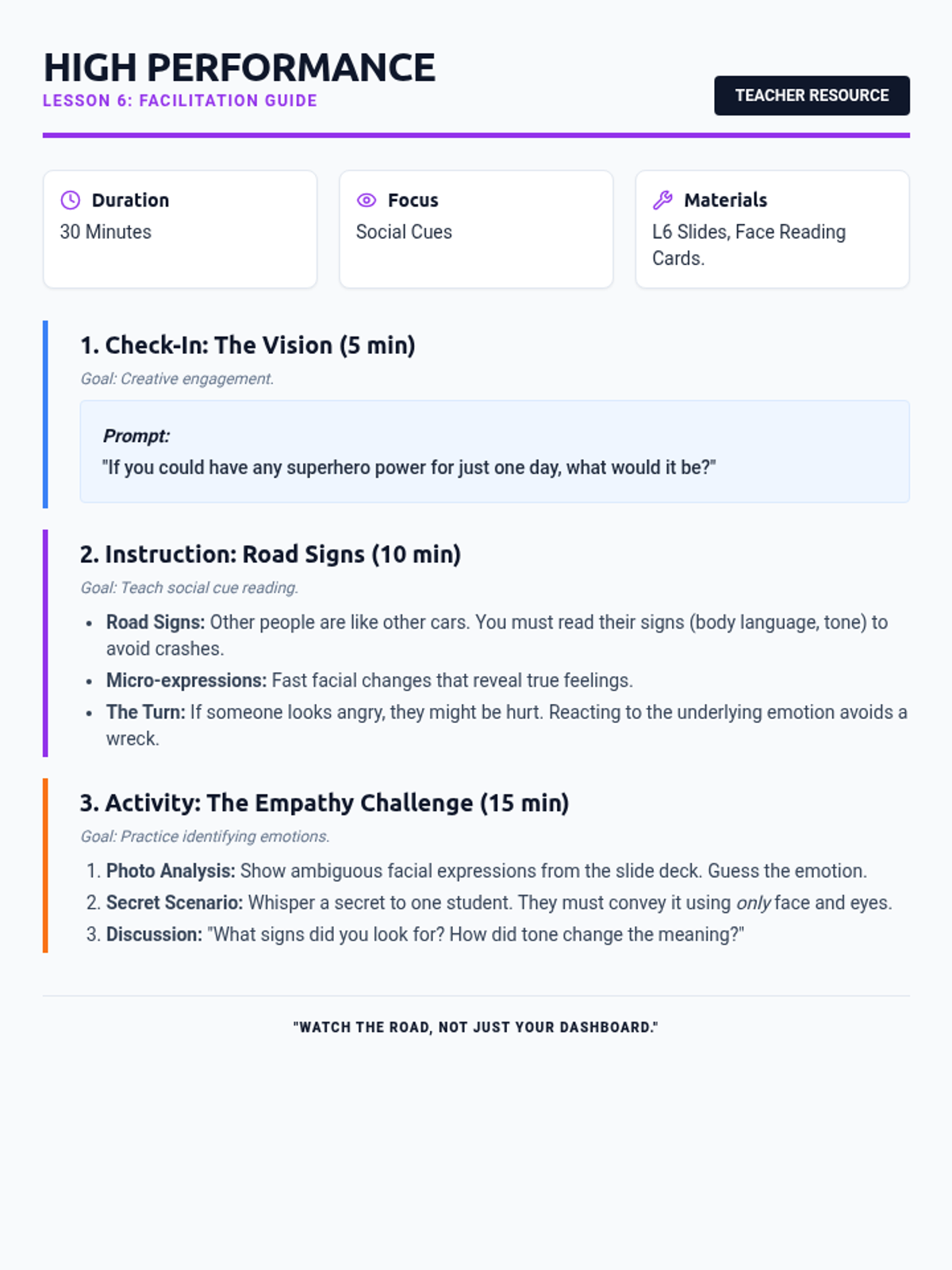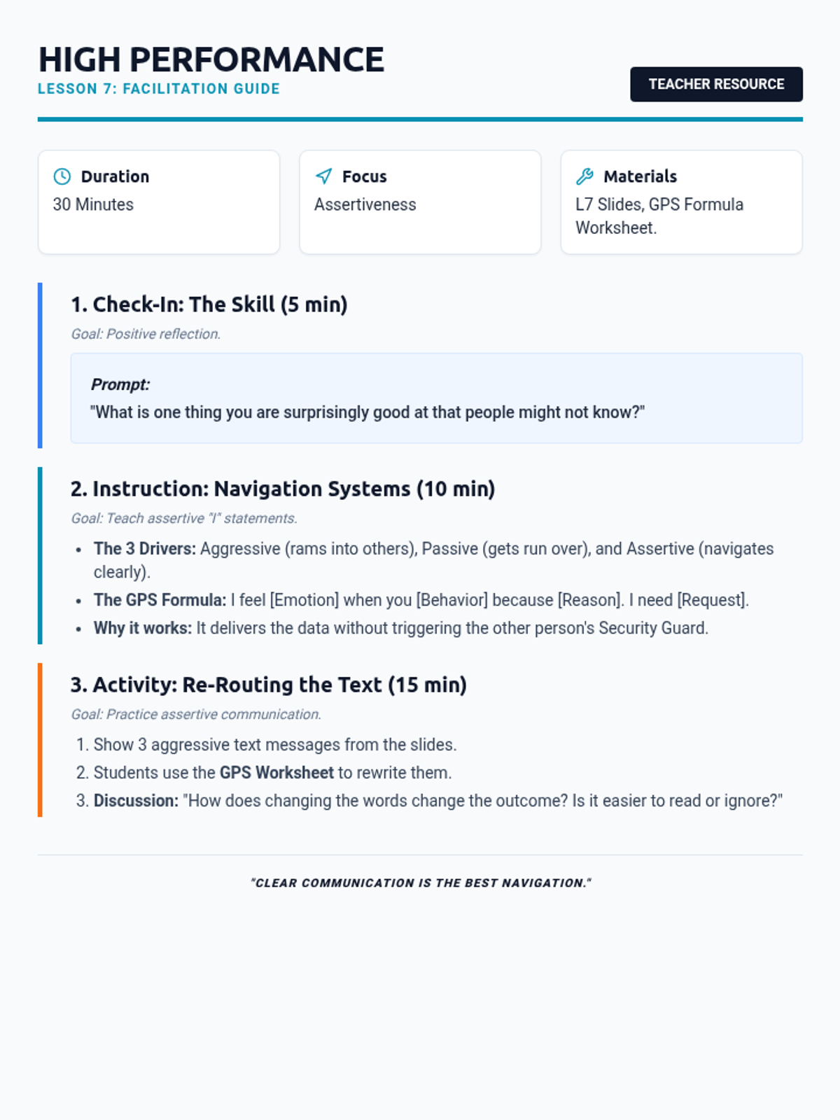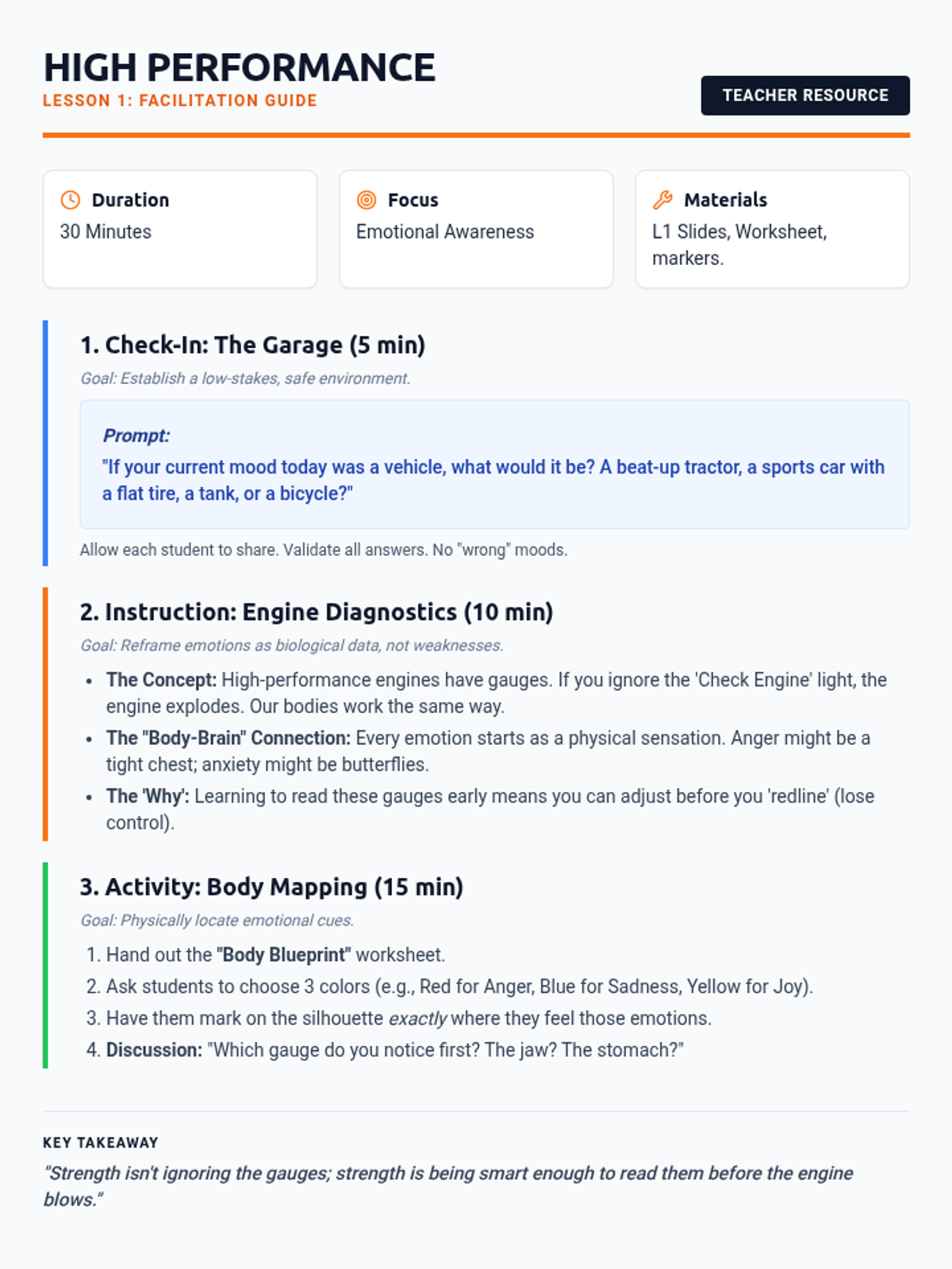 A facilitation guide for teachers leading the first lesson of the High Performance series, including a check-in prompt, instructional talking points, and activity instructions. Revised for better page layout.