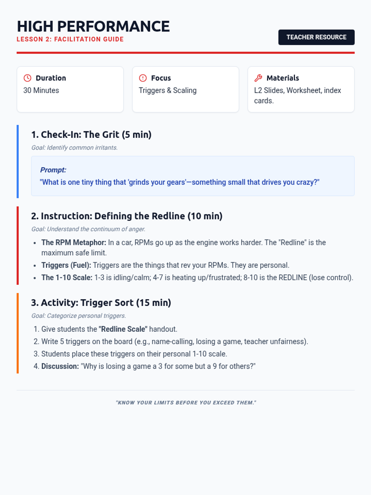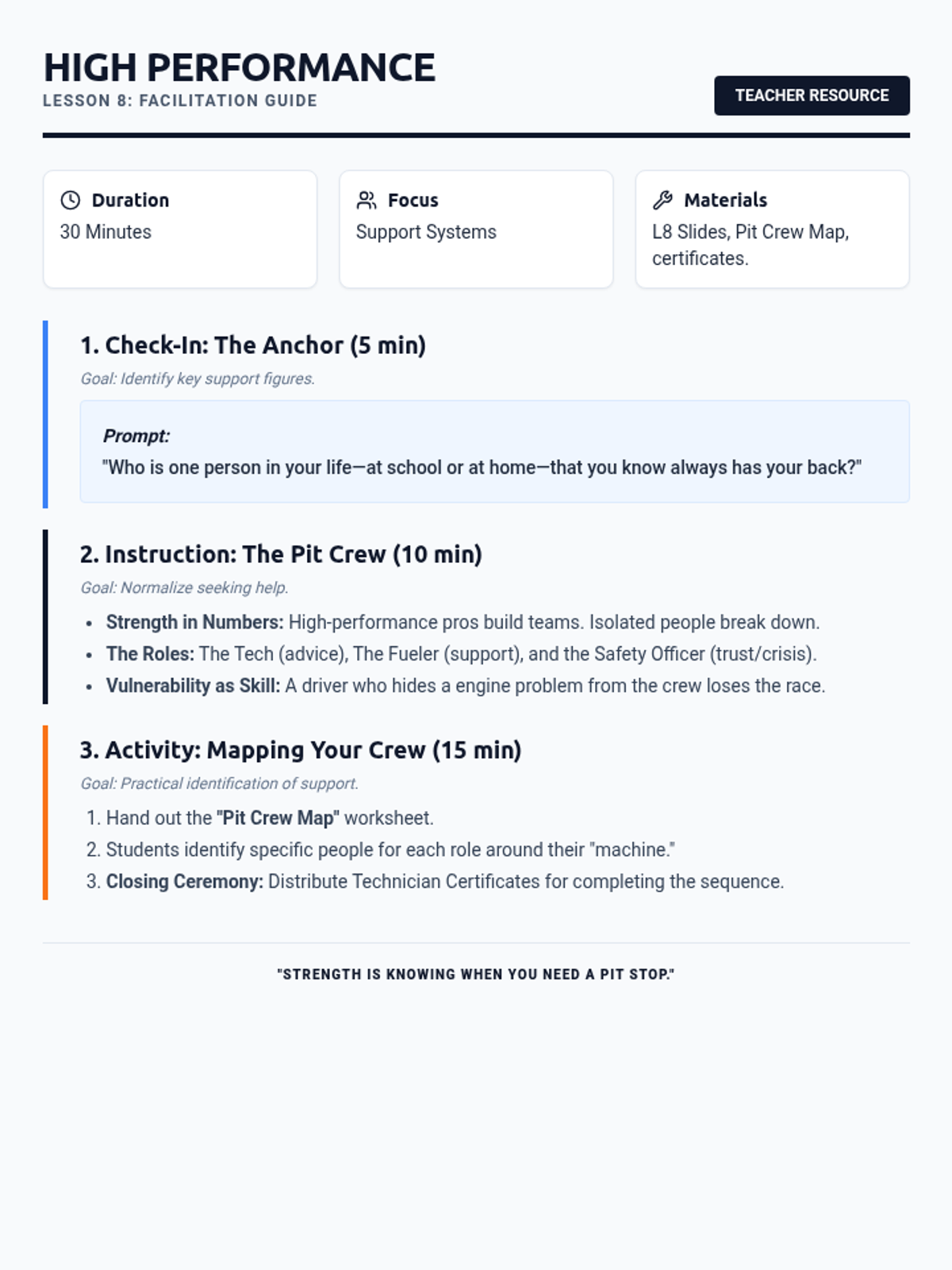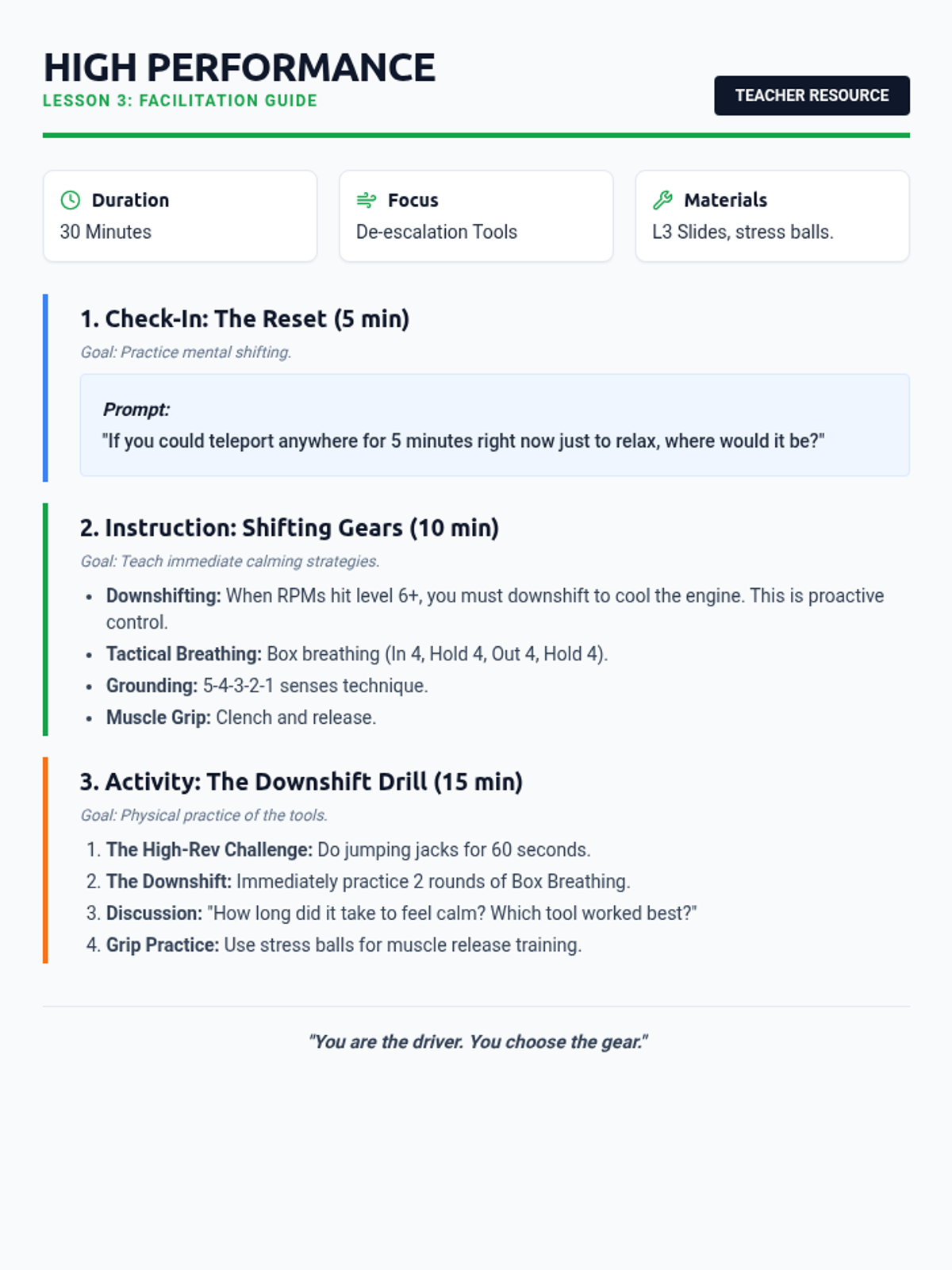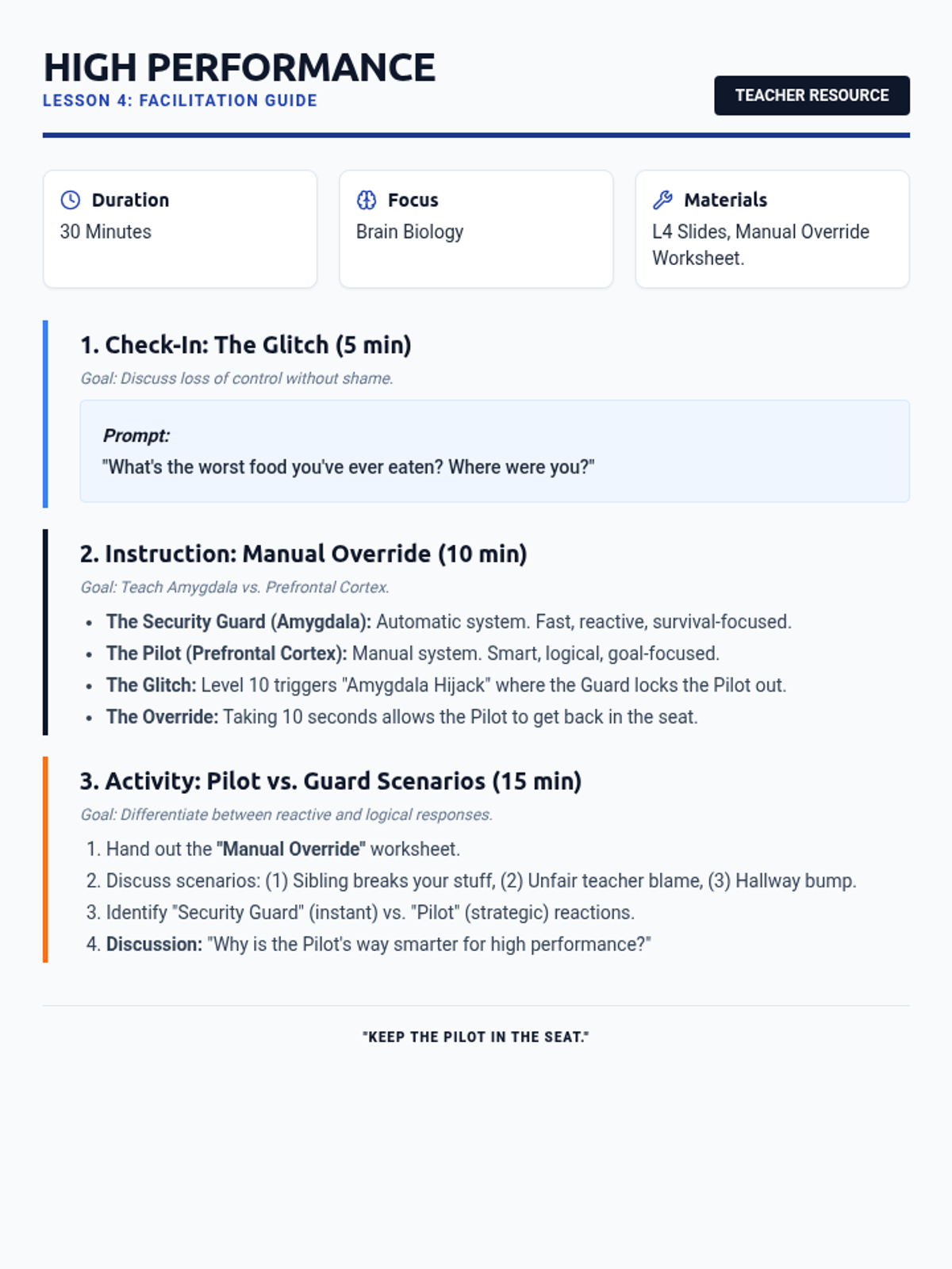 A facilitation guide for teachers leading the first lesson of the High Performance series, including a check-in prompt, instructional talking points, and activity instructions. Revised for better page layout.