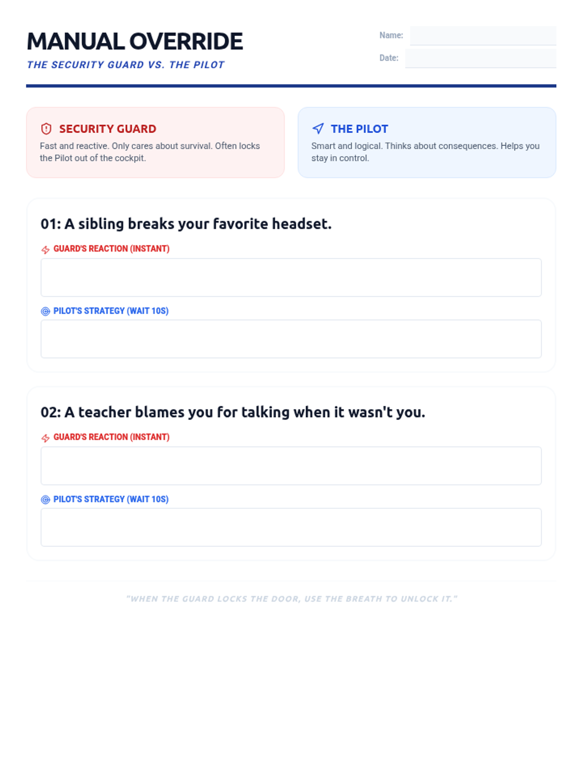 A set of scenario cards where students practice using their 'Control Tower' to manage impulsive situations, followed by a printable 'Certified Pilot' certificate.