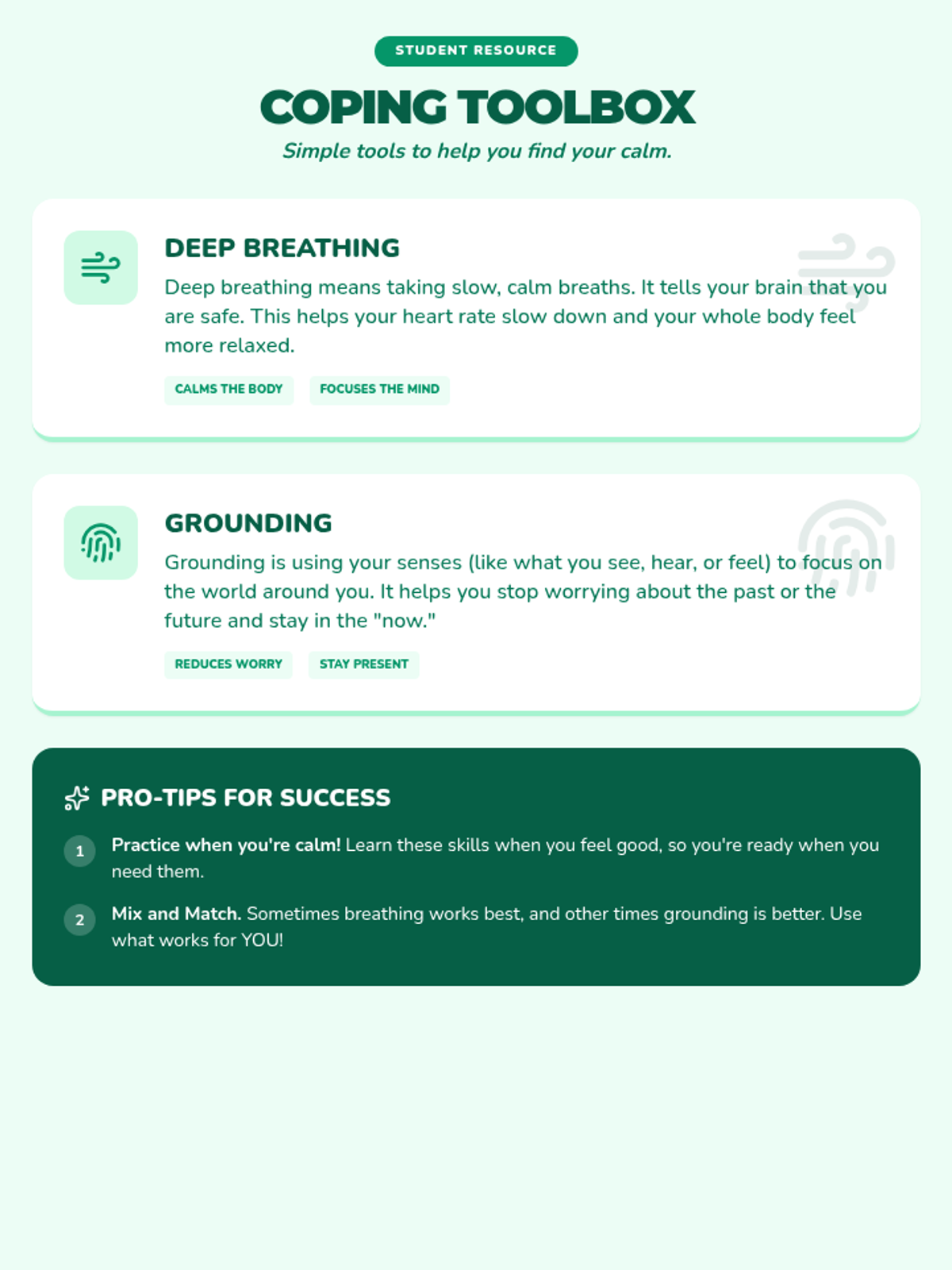 A colorful reference sheet explaining Deep Breathing and Grounding techniques in student-friendly language. It includes definitions and practical tips for using these coping strategies effectively.