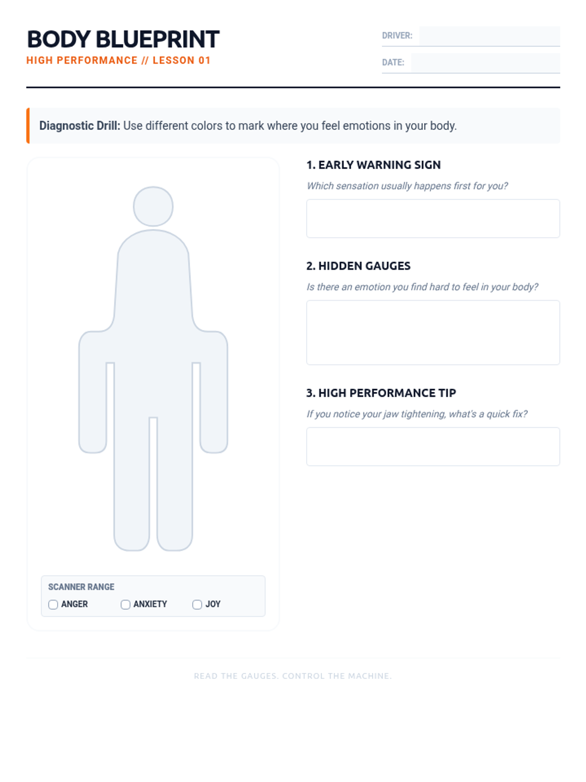 A student worksheet for Lesson 1 where they map emotional physical sensations onto a body silhouette. Revised with a better silhouette, repositioned legend, and consolidated layout.