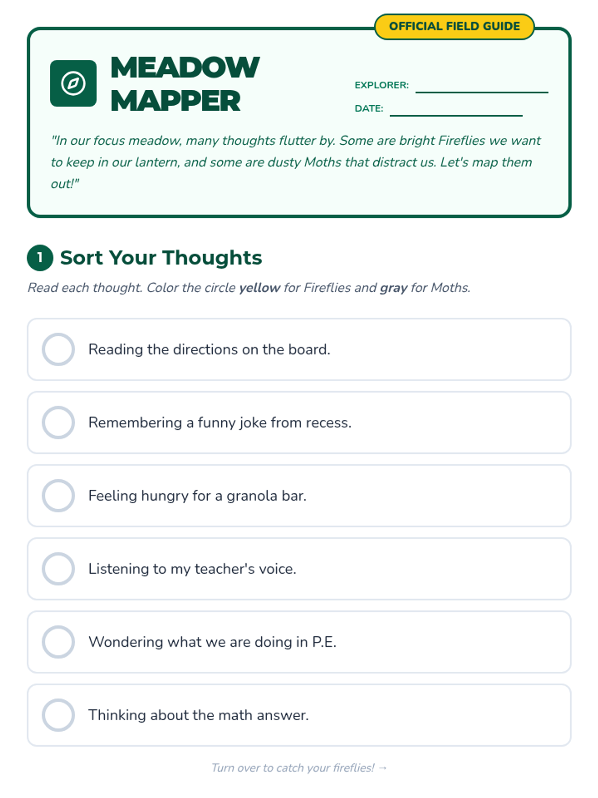A student activity worksheet titled 'Meadow Mapper'. It includes a sorting activity for identifying distracting 'moths' vs. focused 'fireflies' and a drawing area inside a 'lantern' for students to visualize their personal focus goals.