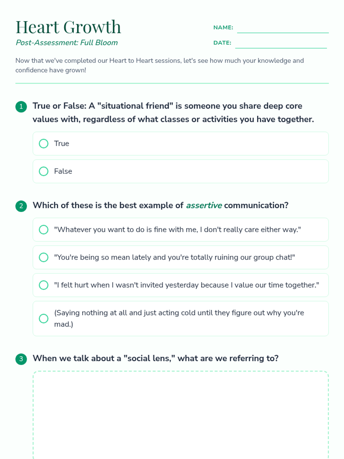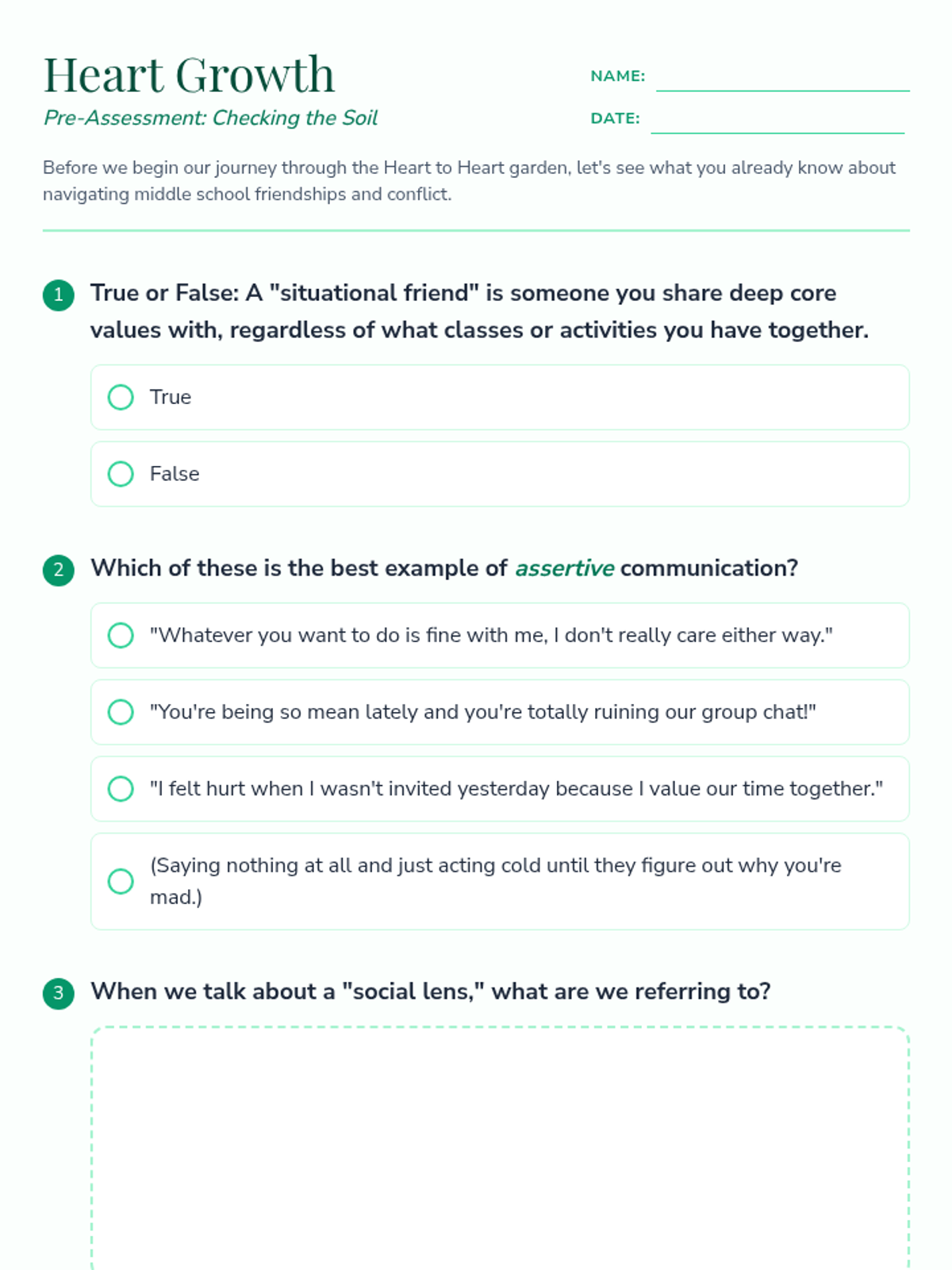A 5-question pre-assessment for the Heart to Heart curriculum, featuring a botanical theme and covering core concepts like friendship types, communication styles, and boundaries. Revised for page breaks and work area space.