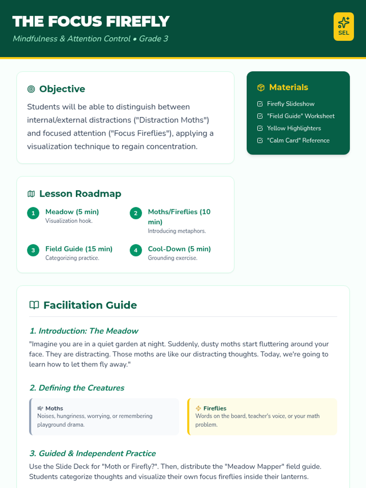 A comprehensive teacher's lesson plan for 'The Focus Firefly', including lesson objectives, timing, material lists, and detailed facilitation instructions for third-grade mindfulness.