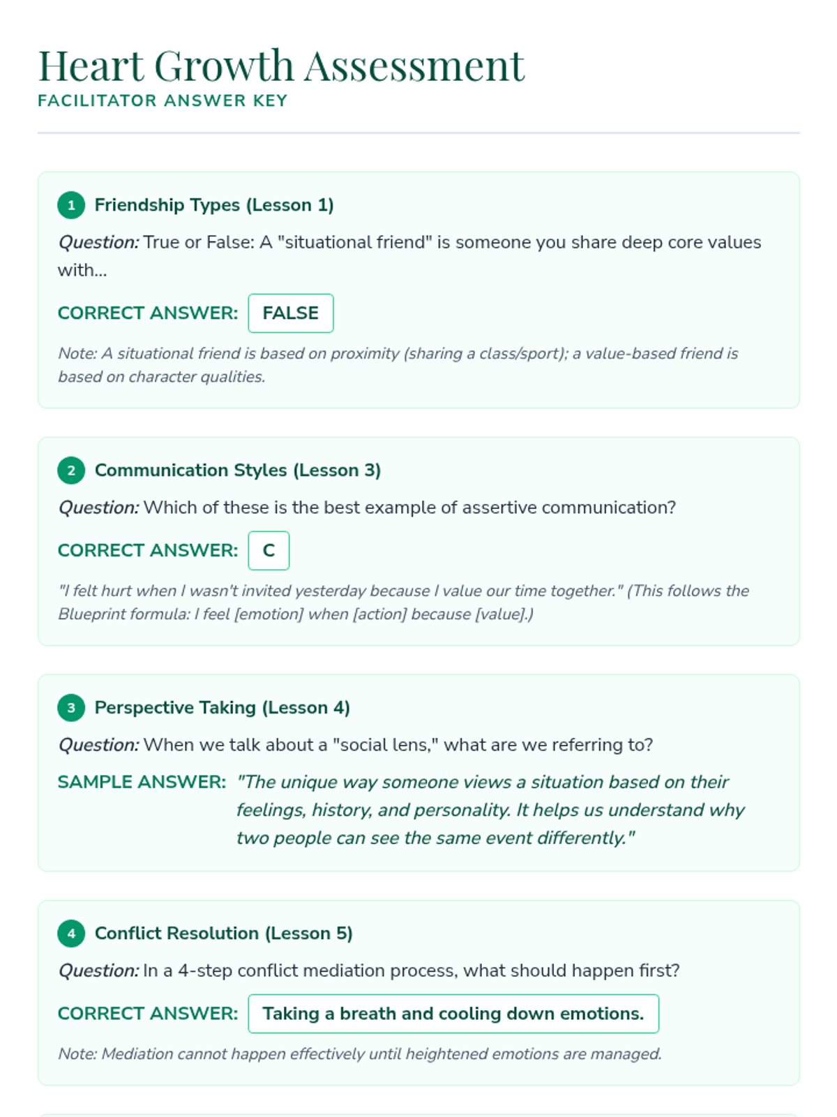 A facilitator's answer key for the Heart Growth assessments, providing correct answers, sample responses, and brief instructional context for each question.