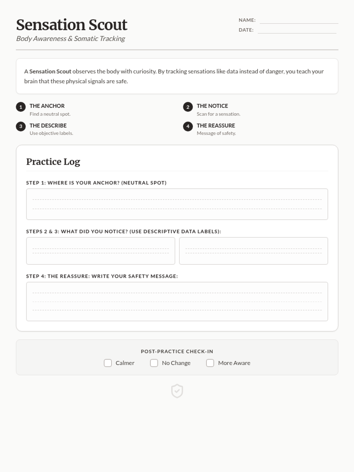 A compact, single-page somatic tracking worksheet with expanded handwriting areas and a streamlined layout.